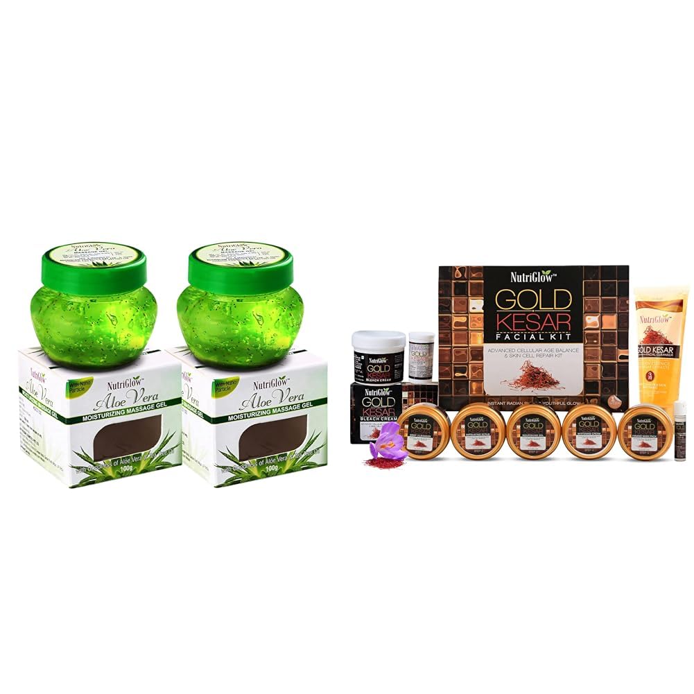NutriGlowAloe Vera Gel Great for Face Hair 100gm Each Pack of 2Gold Kesar Facial Kit (250gm + 10ml) with Bleach Cream (43gm) & Face Wash (65ml) All Skin Types (Pack Of 3)