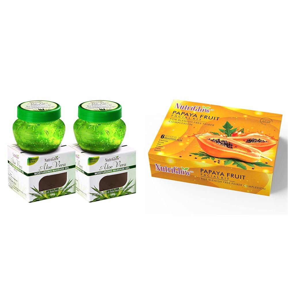 HomeBeautyFace CareFacial KitsNutriGlowAloe Vera Gel Great for Face Hair 100gm Each Pack of 2Papaya Fruit Facial Kit for Men Women for Glowing Skin (250 gm + 10 ml)