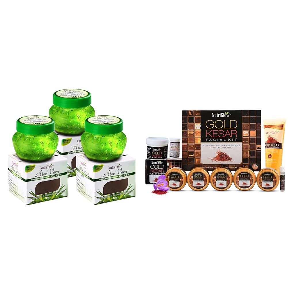 NutriGlowAloe Vera Gel Great For Face Hair 100gm Each Pack of 3Gold Kesar Facial Kit (250gm + 10ml) with Bleach Cream (43gm) & Face Wash (65ml) All Skin Types (Pack Of 3)