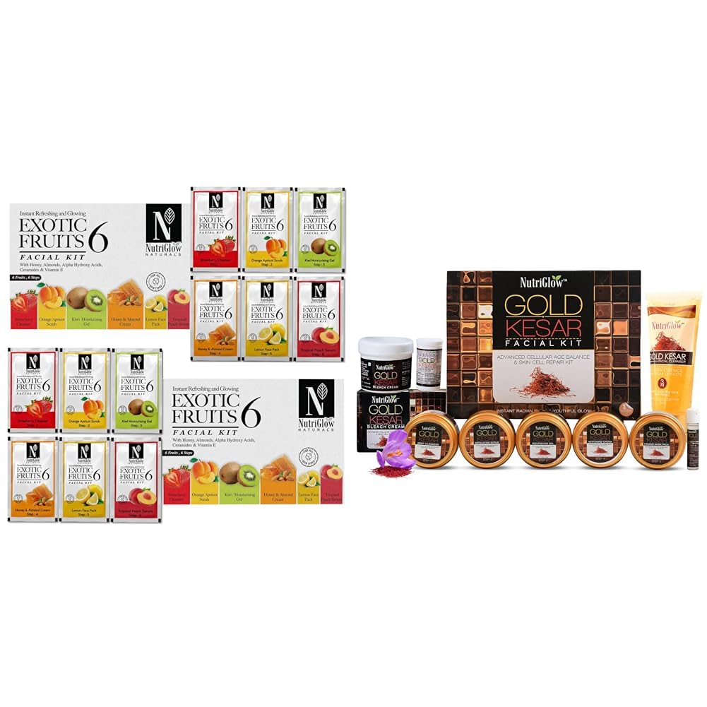 NutriGlowNatural's Exotic Fruit Facial Kit Pack of 2 (60 Gm Each) Gold Kesar Facial Kit (250gm + 10ml) with Bleach Cream (43gm) & Face Wash (65ml) All Skin Types (Pack Of 3)