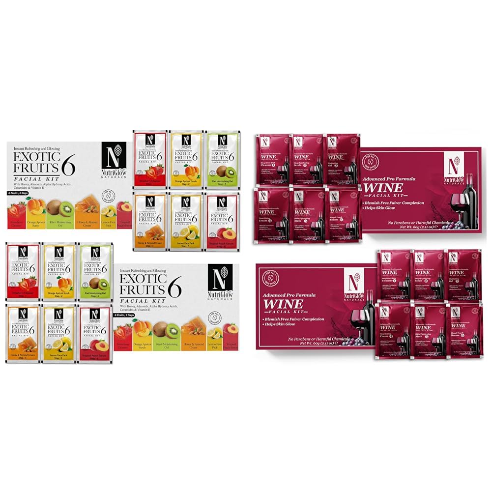 NutriGlowNatural's Exotic Fruit Facial Kit Pack of 2 (60 Gm Each) NATURAL'S Advanced Pro Formula Wine Facial Kit for Blemish Free Fairer Complexion & Helps Skin Glow 10gm x 6 Each Pack of 2
