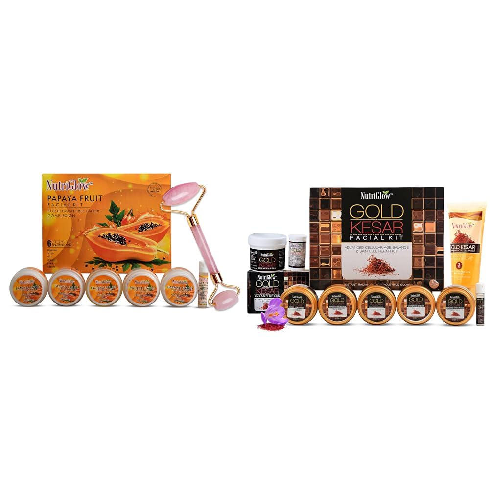 NutriGlowPapaya Facial Kit For Blemish Free and Fairer Skin Hydrated & Brightening Fresh Looking Skin With Jade RollerGold Kesar Facial Kit (250gm + 10ml) with Bleach Cream (43gm) & Face Wash (65ml)