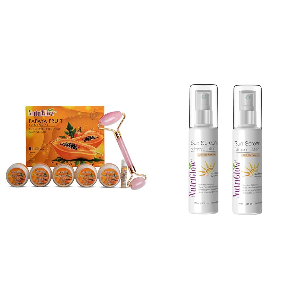 NutriGlowPapaya Facial Kit For Blemish Free and Fairer Skin Hydrated & Brightening Fresh Looking Skin With Jade RollerSunscreen Lotion SPF 40 & PA+++ 120ml (Pack of 2)