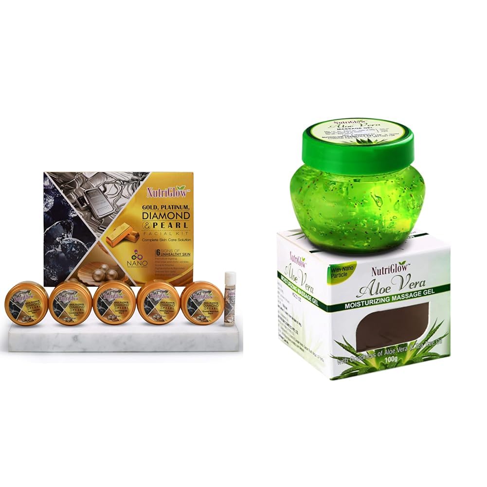 NutriGlowPlatinum Diamond Gold and Pearl Facial kit 6-Pieces Skin Care Kit Aloe Vera Gel Great for Face Hair 100gm