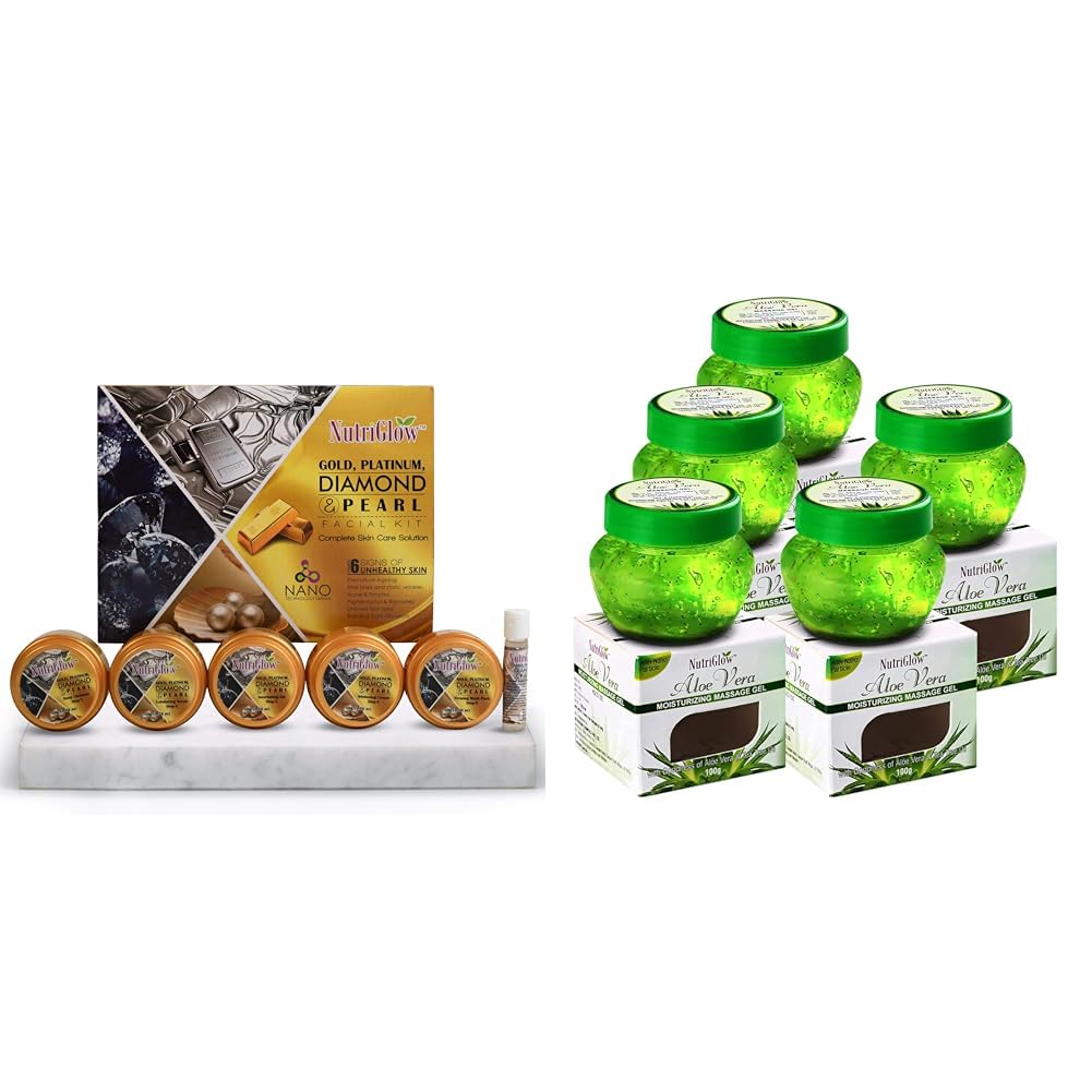 NutriGlowPlatinum Diamond Gold and Pearl Facial kit 6-Pieces Skin Care Kit Aloe Vera Gel Great for Face Hair 100gm Each Pack of 5