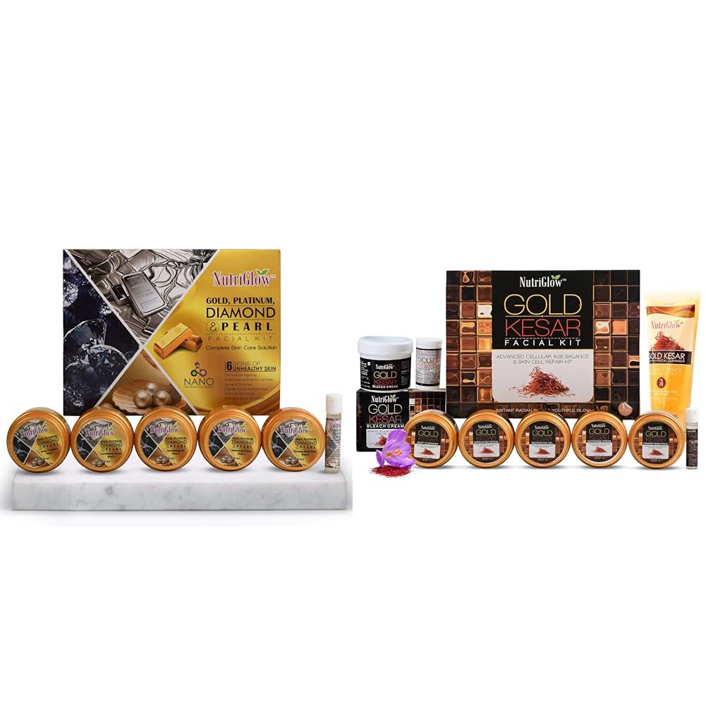 NutriGlowPlatinum Diamond Gold and Pearl Facial kit 6-Pieces Skin Care Kit Gold Kesar Facial Kit (250gm + 10ml) with Bleach Cream (43gm) & Face Wash (65ml) All Skin Types (Pack Of 3)