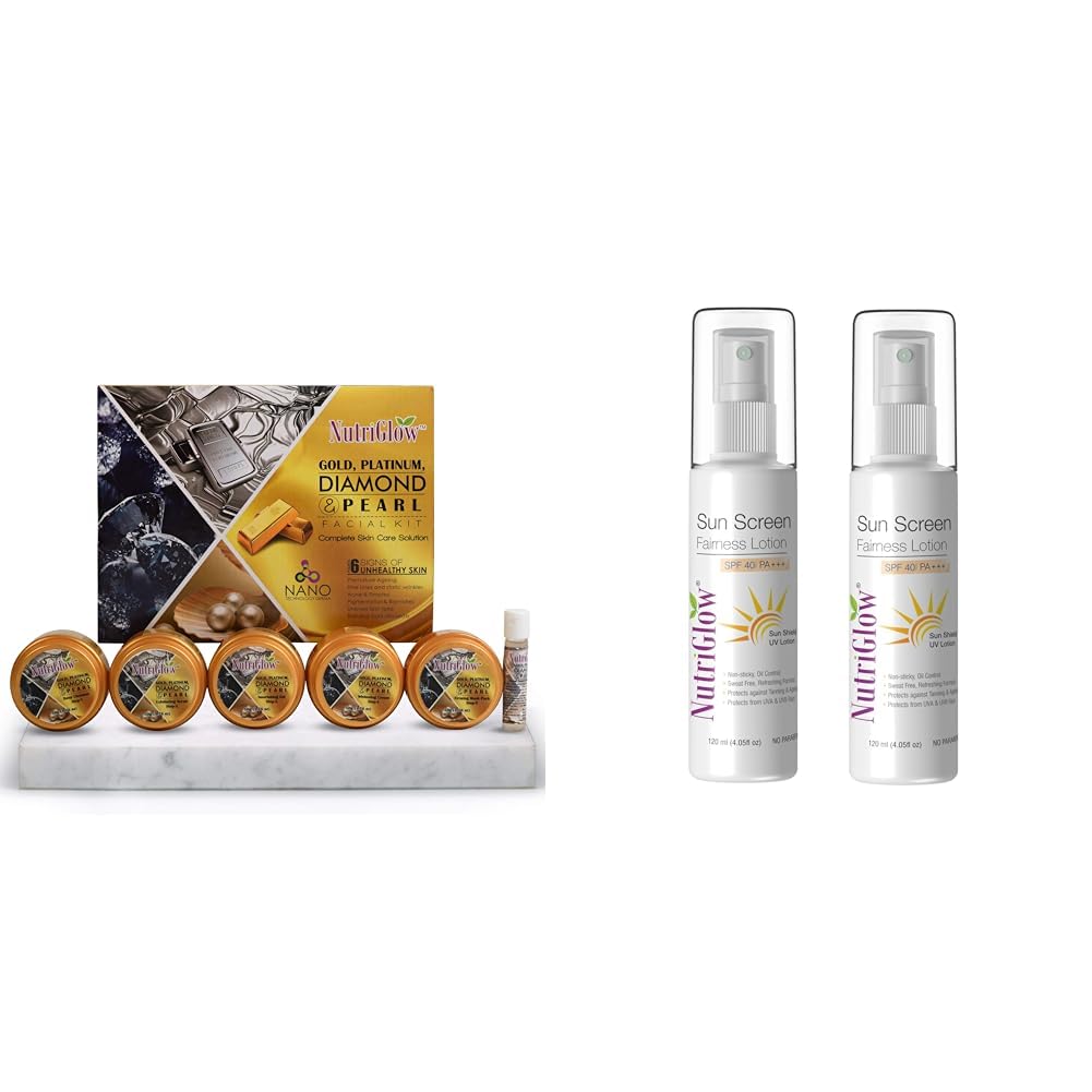 NutriGlowPlatinum Diamond Gold and Pearl Facial kit 6-Pieces Skin Care Kit Sunscreen Lotion SPF 40 & PA+++ 120ml (Pack of 2)