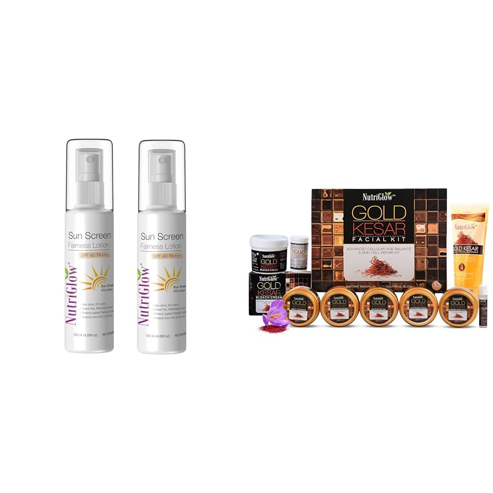 NutriGlowSunscreen Lotion SPF 40 & PA+++ (Pack of 2) Gold Kesar Facial Kit (250gm + 10ml) with Bleach Cream (43gm) & Face Wash (65ml) All Skin Types (Pack Of 3)