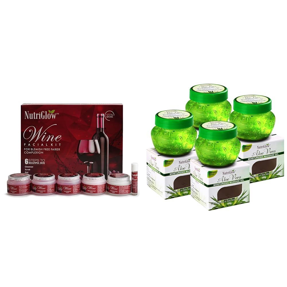 HomeBeautyFace CareFacial KitsNutriGlowWine Facial Kit For Radiant Glow- 250g+10mlAloe Vera Gel for Face Hair Acne Sunburn Bug Bites Rashes Glowing and Radiant Skin - Non Sticky All Skin & Hair Types 100 gm Each Pack of 4