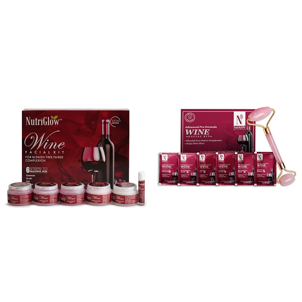 NutriGlow Wine Facial Kit contains Wine Deep Cleanser-10g Wine Exfoliation Scrub-10g Wine Nourishing Gel-10g Wine Whitening Cream-10g Wine Firming Mask Pack-10g and Wine Serum-10ml Free Jade Roller is suitable for both oily and Dry skin.