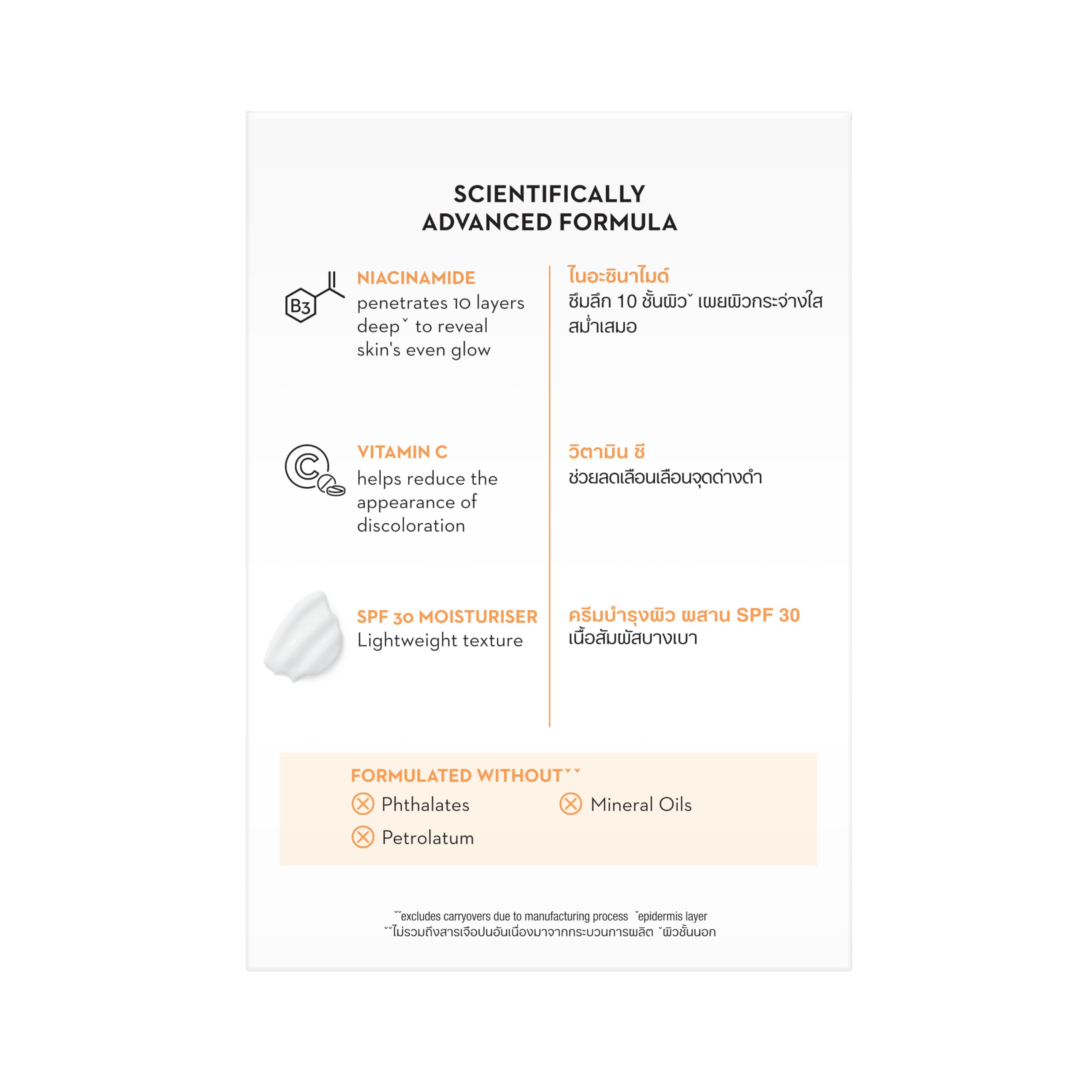 BIOAVAILABLE VITAMIN C: Deeply penetrates your skin to reveal a healthy glow. Olay's Vitamin C Moisturiser leaves your skin glowing and hydrated SUN PROTECTION WITH SPF30: Contains broad spectrum SPF 30 to protect from harmful UV radiation. Crafted with a lightweight formulation that absorbs quickly FIT FOR ALL: Suitable for all skin types including sensitive skin PACKED WITH GOODNESS : The product does not contain ingredients that may be harmful for your skin like (i) Sulphates (ii) Parabens (iii) Phthalates (iv) Perfumes (v) Artificial dyes (vi) Essential Oils (vii) Fragrances