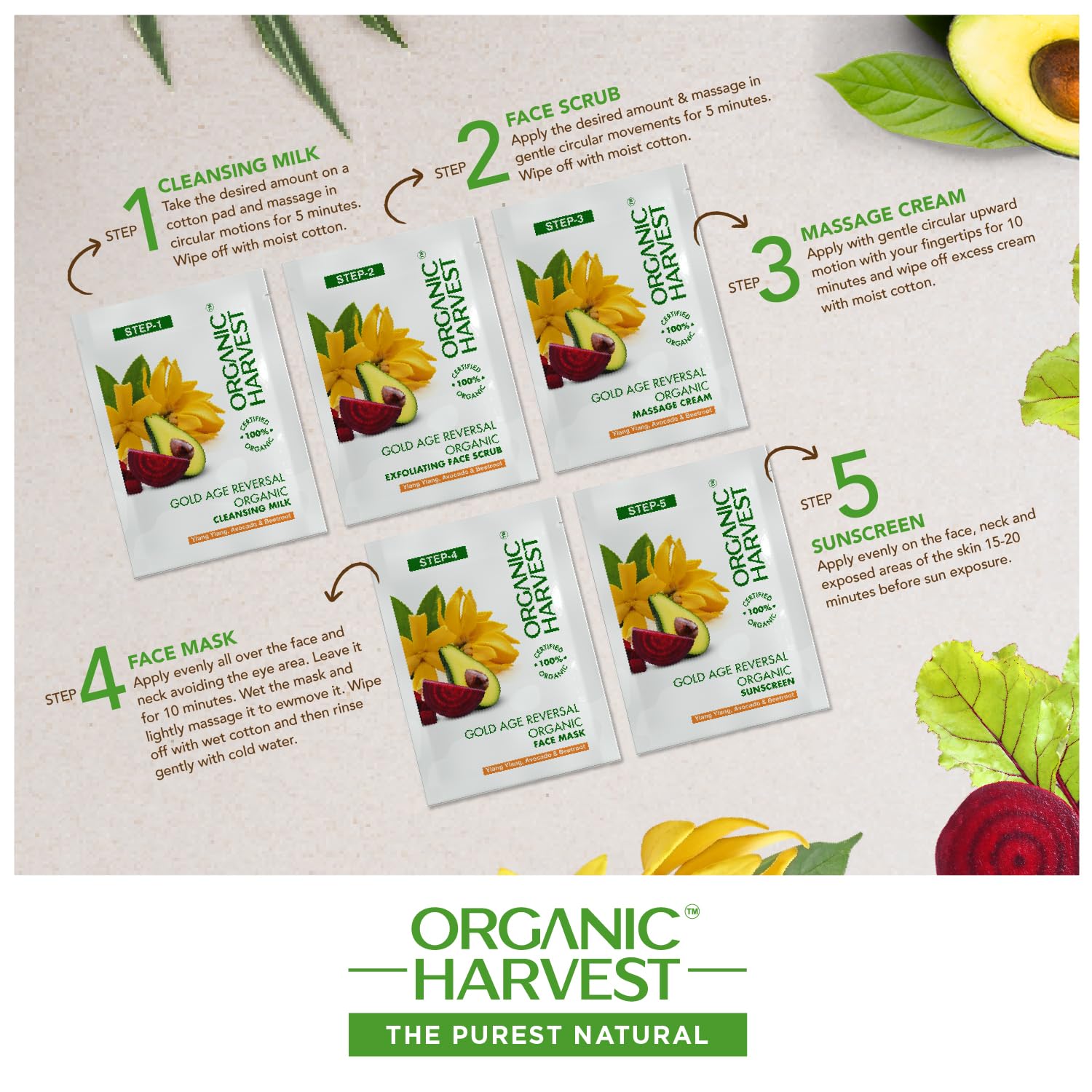 Organic Harvest Gold Age Reversal Make Over Facial Kit For Women | 5 Easy Steps | Rejuvenates Skin Cells Reduces Fine Lines & Signs of Ageing Natural Glow To Skin | Ideal For All Skin Type | Paraben Sulphate & Chemical Free - 40g