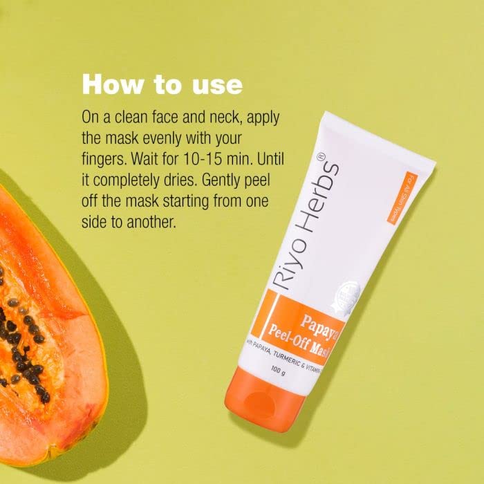 Riyoherbs papaya peel off mask is packed with vitamin C & E which rejuvenates skin. The papaya peel off contains. Enzymes that help remove dead skin cells whiteheads blackheads from the surface of skin. Papaya peel off mask benefits in treating pigmentation blemishes & age spots. Natural extracts like papaya cucumber turmeric orange peel makes it suitable for all skin types. Regular use makes skin glowing soft and supple. Riyoherbs Papaya Face Scrub is a very gentle and nourishing face scrub with papaya enzymes turmeric extract walnut granules to dissolve dead skin cells unclog open pores & give natural brightness to a more younger looking skin. papaya extract is a magical ingredient that clears out the scars and uneven pigmentation on the skin. The skin lightening properties of the fruit help in getting rid of blemishes and pigmentation.