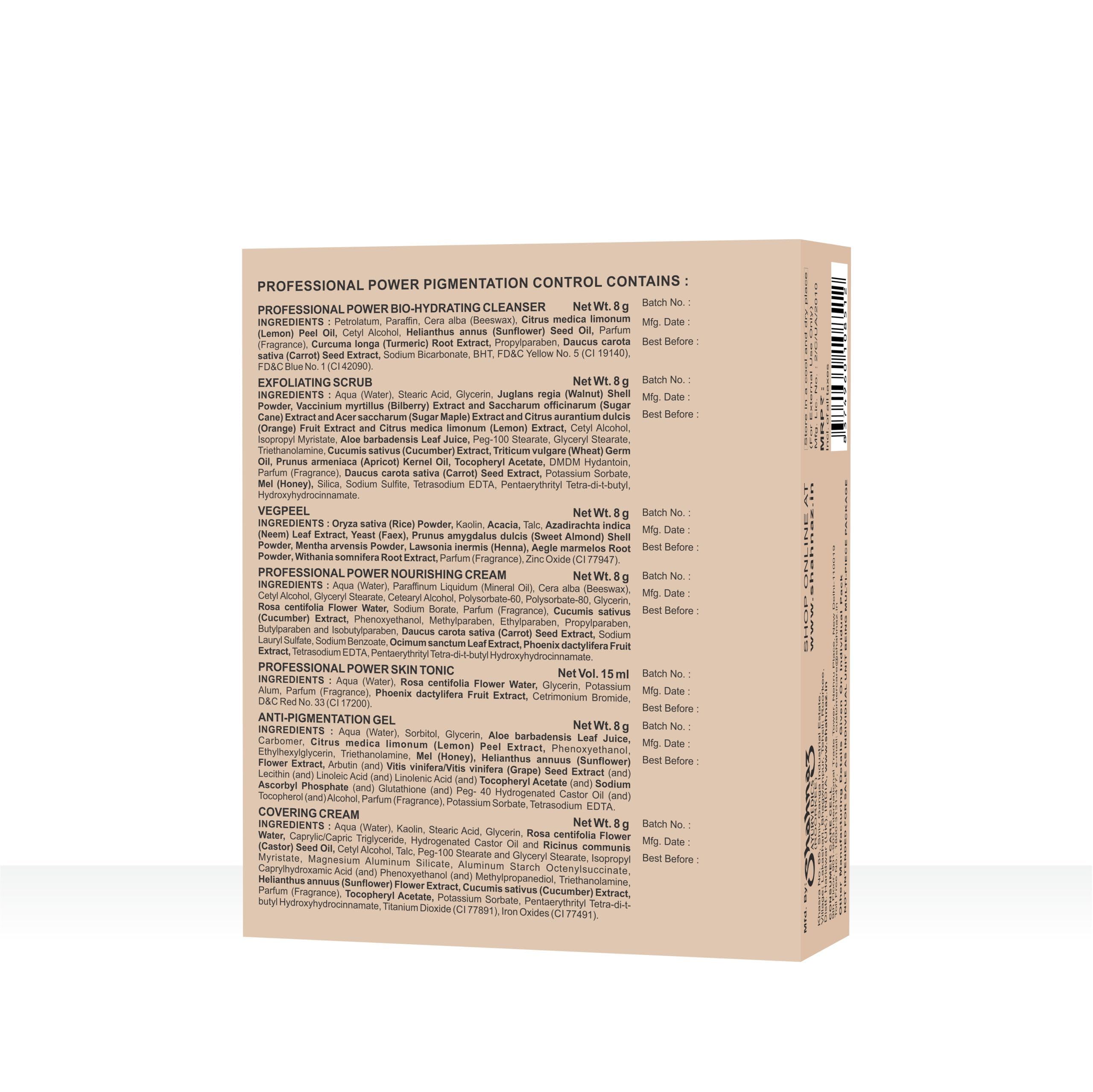 Cleanse face with Bio Hydrating Cleanser. Apply and wipe with moist cotton wool. Apply Scrub and rub gently with small circular movements. Wash off. Mix VegPeel powder with milk and egg. Apply on face and rub gently on skin first with clockwise strokes and then with anti-clockwise strokes. Wipe off after rubbing it on face. Apply Nourishing Cream on face and neck and massage for 15 minutes with a little water. Give cold compress with chilled skin tonic. Apply anti-pigmentation gel and leave on. Wait for a few minutes and apply cover cream. Leave on.