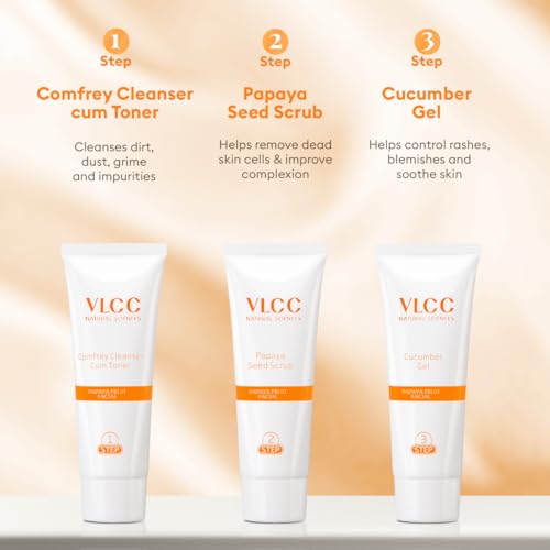 • This kit comes with 6 tubes i.e. Comfrey cleanser cum toner papaya seed scrub cucumber gel peach massage cream orange anti tan pack and oil free moisturizing gel.