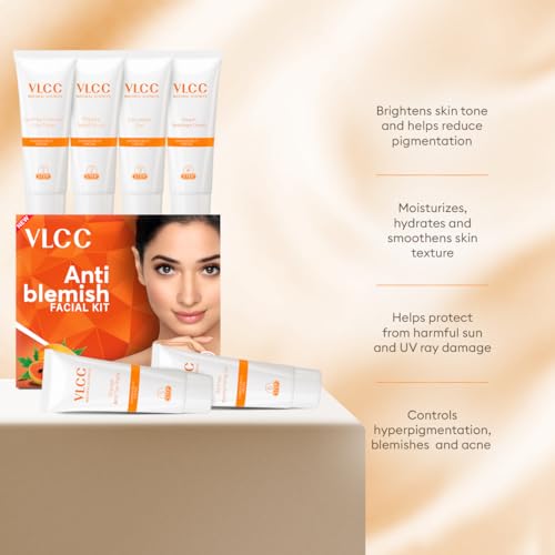 • VLCC Anti Blemish Facial Kit is a fruit based facial kit to brighten nourish and protect skin. Pamper your skin with our at-home facial kit aimed to enhance and unify complexion fade blemishes and provide long lasting nourishment.