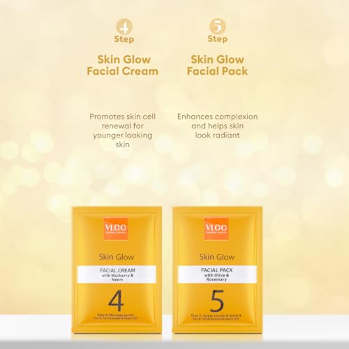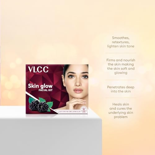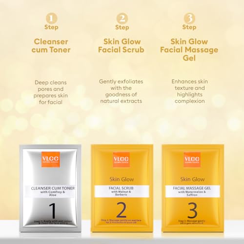 • VLCC Skin Glow Facial Kit is enriched with Saffron Cucumber Mulberry & Nutmeg extracts.