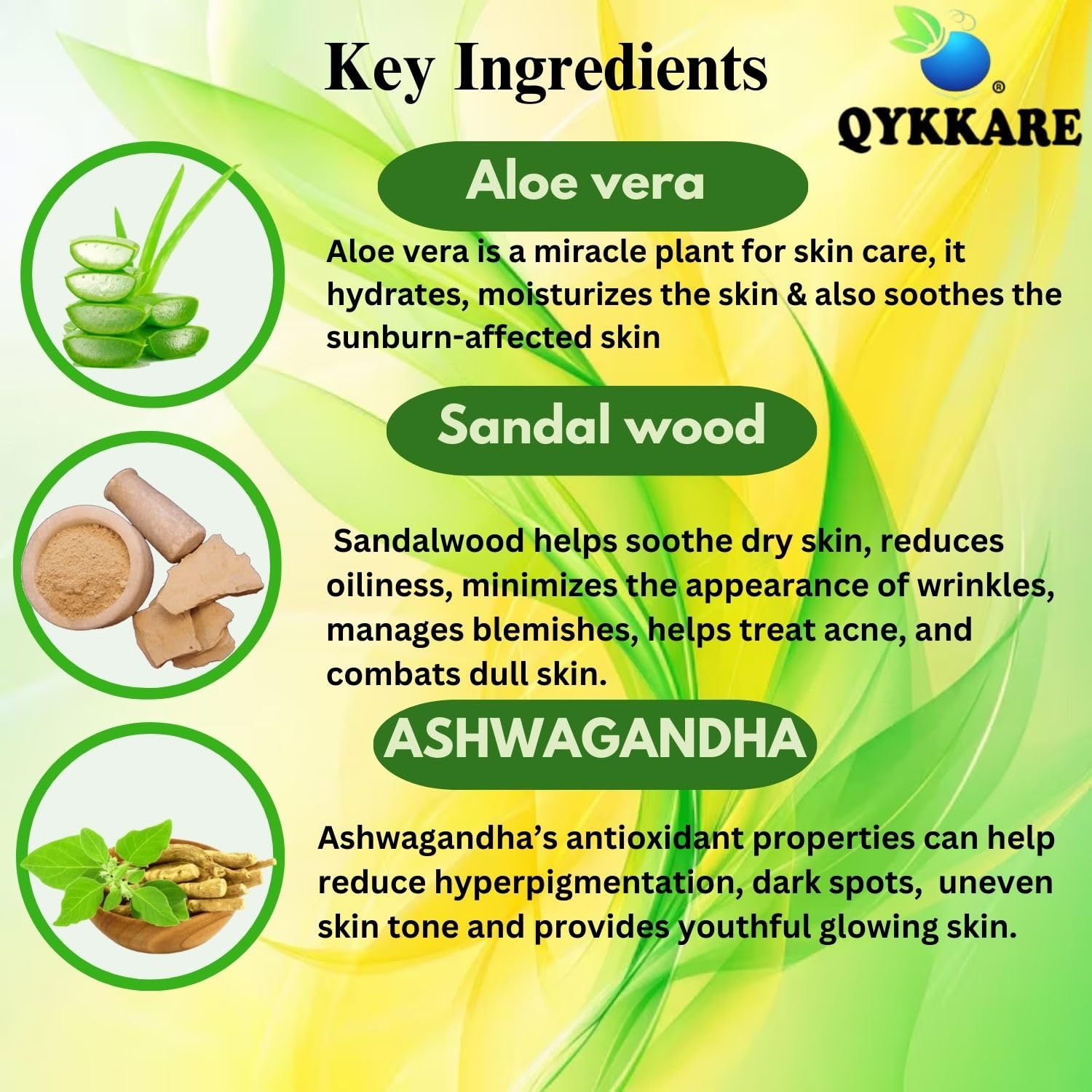 Qykkare Aloevera Sandal Gel and Aloe Ashwagandha Gel is created from freshly pulped Aloe Vera & Ashwagandha leaves to retain maximum benefits for you and your skin. The combination of a soothing sensation