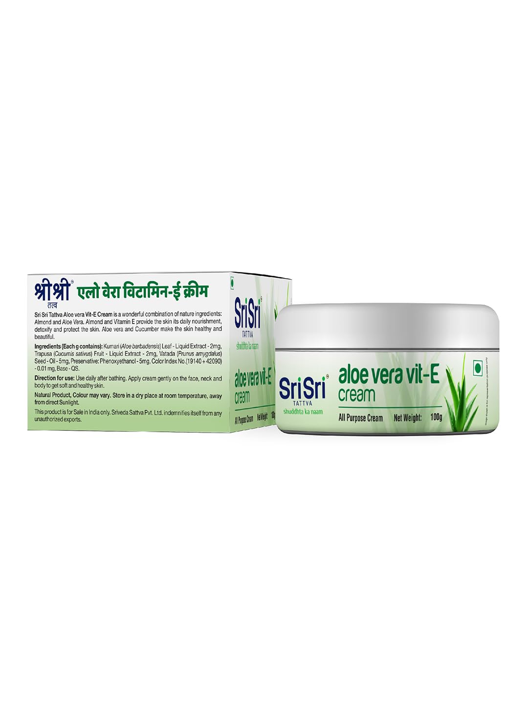 Sri Sri Tattva Aloe vera Vit-E Cream is a wonderful combination of natural ingredients: Almond and Aloe Vera. Almond and Vitamin E provide the skin with its daily nourishment detoxify and protect the skin. Aloe vera and Cucumber. healthy. make the skin healthy aria beautiful.