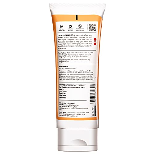 A luxurious massage cream Jiva Carrot Cream provides deep nourishment to your skin. Made with pure herbs extract and oil this cream is suitable for usage for all skin types and is paraben and silicone-free. It contains the goodness of herbs and natural actives that nourishes your skin from deep within like Carrot Wheat Germ Tomato White Lilly Sunflower Safflower and Lodhra. The formative action of Carrot is on the epidermal cells. It is a powerful de-tanning agent. It also naturally reduces the damaging effects of UV radiation. Wheat Germ Oil is one of the richest sources of vitamin E A and D. It also has a high content of proteins and lecithin. It restores a smooth radiance and elasticity to the skin. Rich in lycopene an antioxidant found in tomatoes it can repair damaged skin and restore its natural healthy glow. Its acidic and astringent properties make it an excellent ingredient for individuals with oily and acne-prone skin.