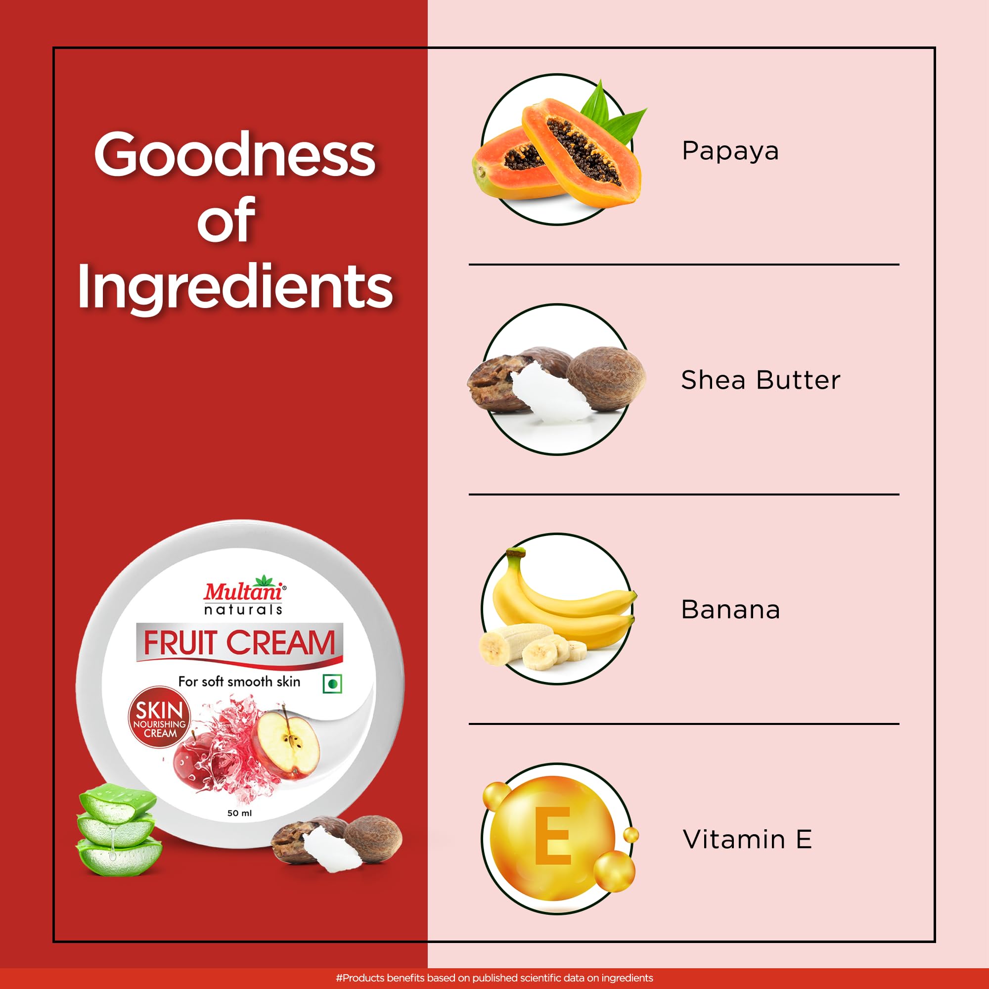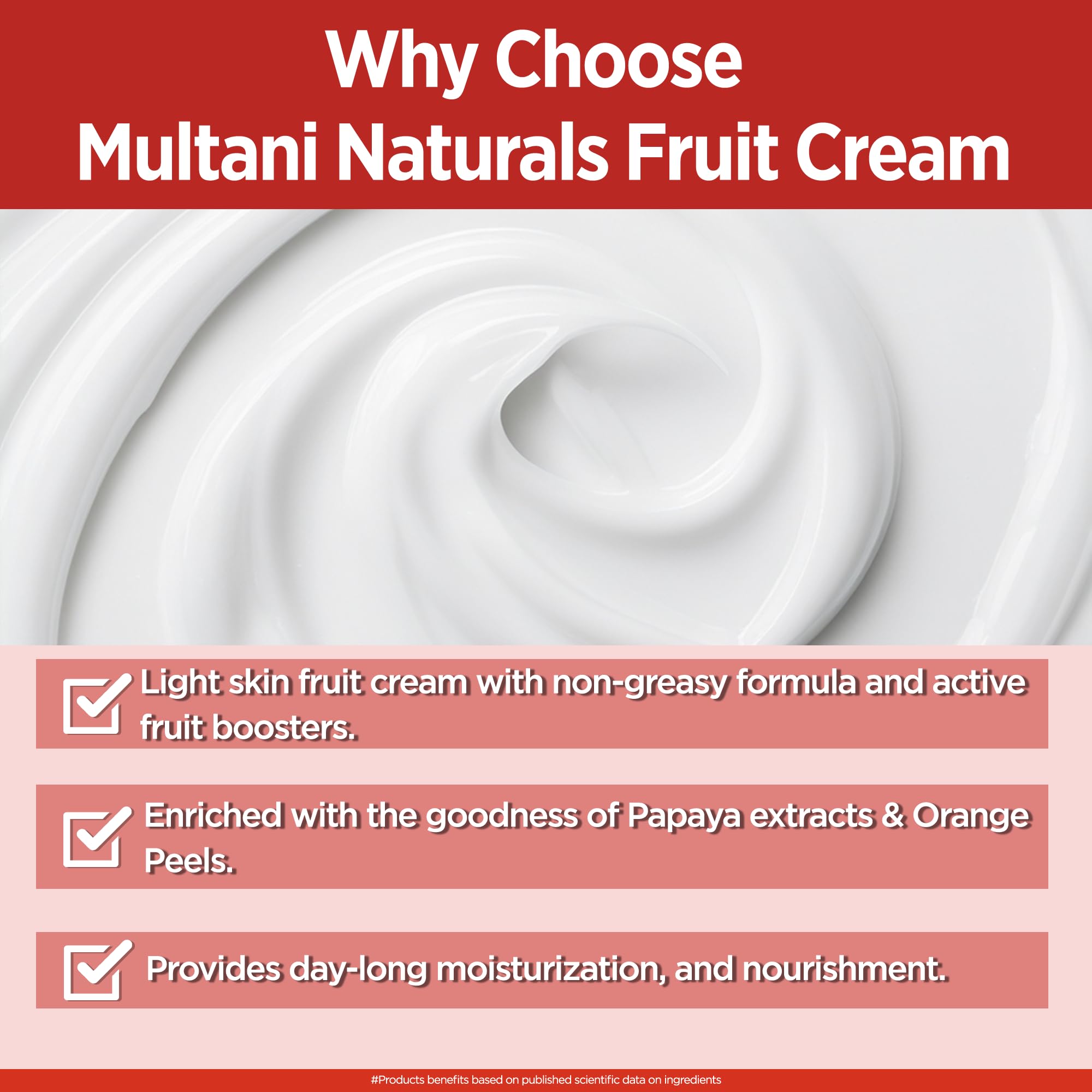 Multani Naturals Fruit Cream for Soft Smooth Skin is a lightweight and nourishing cream that is perfect for all skin types. This unique formula is packed with the goodness of Papaya and Orange Peel extracts which help brighten and even out your skin tone while providing deep hydration for a healthy-looking glow. The lightweight formula absorbs quickly without clogging pores making it a great choice for those with normal to oily skin. This cream is also free from harsh chemicals and is gentle enough for even sensitive skin. How to Use: Apply evenly to the face neck and hands. Use daily for best results. Caution: Avoid contact with eyes. If contact occurs rinse thoroughly with water. Store in a cool and dry place away from direct sunlight. For external use only. Note: Even natural ingredients can cause allergies in some people. A patch test is recommended before applying the cream to your entire face.