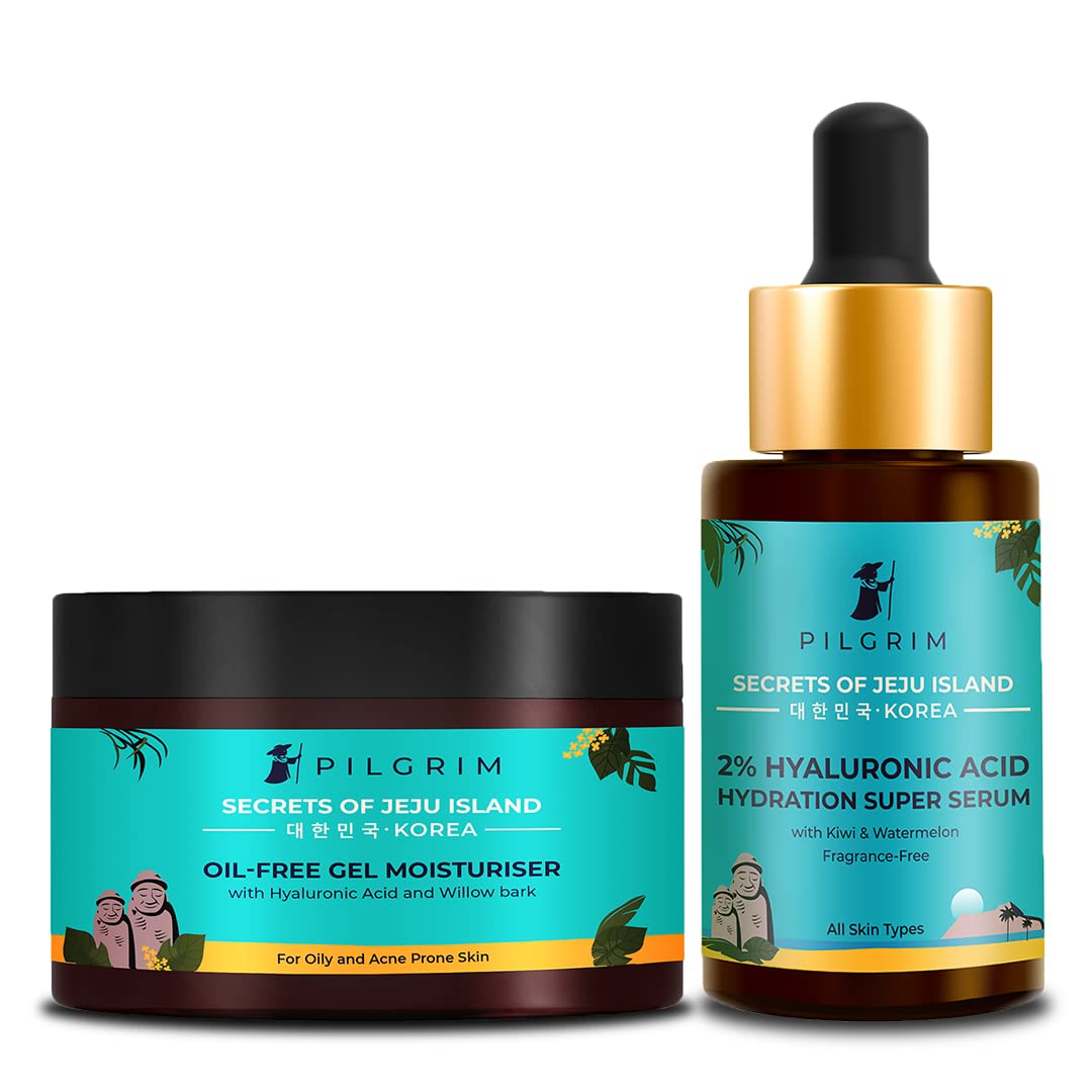 Pilgrim All Day Hydrator Combo | 2% Hyaluronic Acid Hydration Super Serum 30ml Oil Free Gel Moisturizer 50gm | For Face Pigmentation & Glowing Skin | All Skin Types | Korean Skin Care | Men & Women