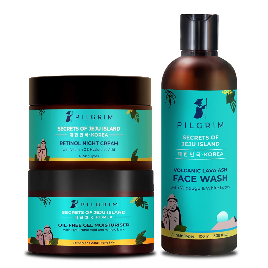 Pilgrim Power Brightening Face Kit | Oil Free Gel Moisturizer 50gm Pore Cleansing Face Wash 100ml Retinol Booster Skin Glow Night Cream 50g | For All Skin Types | Korean Skin Care | Men & Women