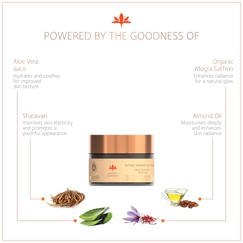 Our Advanced Kumkumadi Refined Radiance Day Cream smells like Lotus and that is why it can be called Padmagandhi. This Cream is filled with the goodness and richness of Ashwagandha Jasmine water Shatavari extract Almond oil Kumkumadi oil and other rich Ayurvedic herbs. As you apply this Cream to your cleansed and toned face it glides like dew on the lotus petal and nourishes your skin like no other skin nectar. This antioxidant-rich lightweight protective day cream penetrates deep into the skin and gives a dewy glow. 100% Organic Mongra Saffron enhances radiance evens skin tone reduces pigmentation and nourishes the skin while reducing the harmful effects of environmental aggressors.