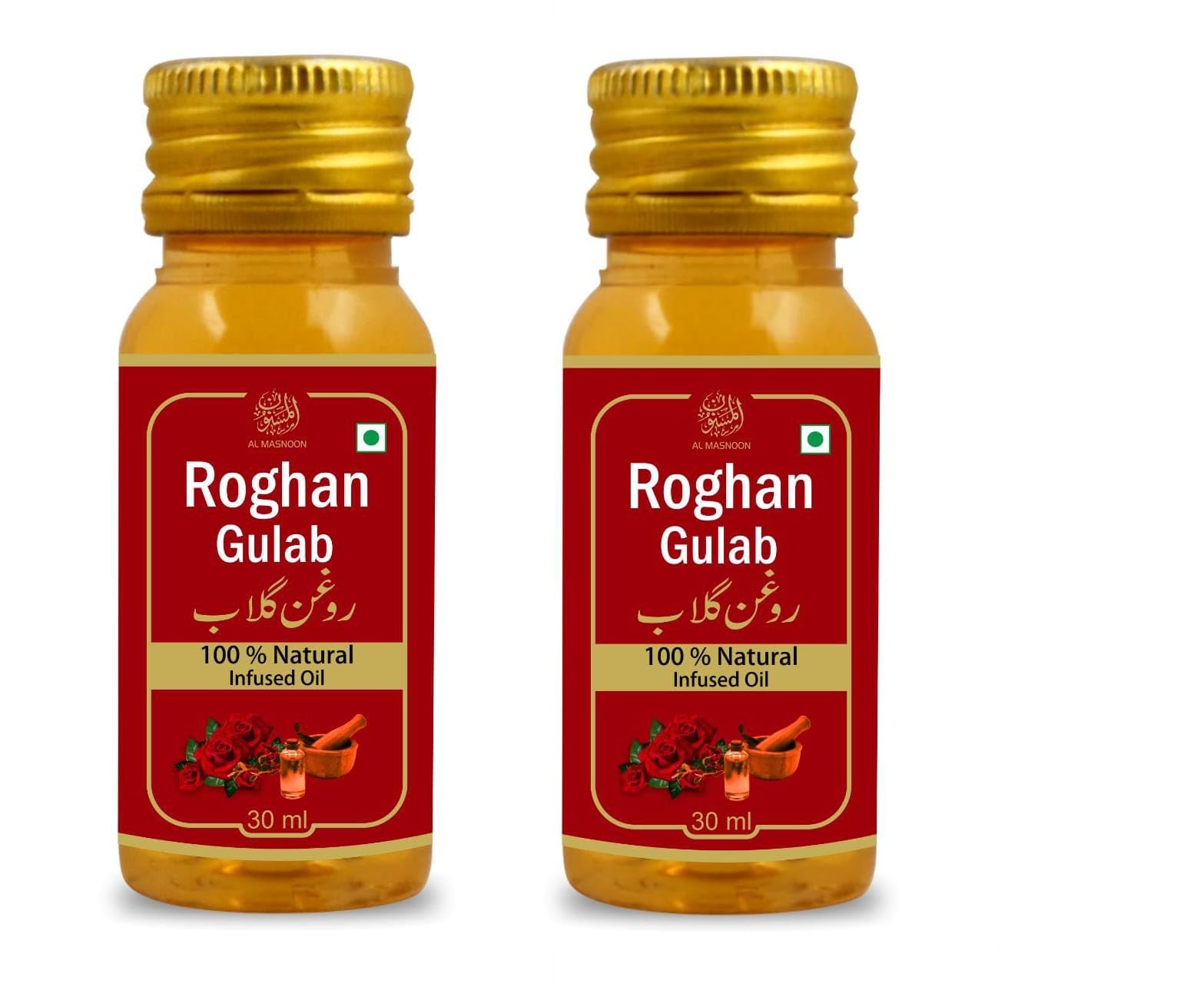 Elevate your self-care routine with Al Masnoon Roghan Gulab a luxurious and 100% natural infused rose oil. This premium quality oil available in a convenient pack of 2 is meticulously crafted to harness the full benefits of pure rose petals. Each 30ml bottle offers a rich aromatic experience that is perfect for skin care aromatherapy and hair nourishment.Indulge in the timeless beauty and therapeutic benefits of Al Masnoon Roghan Gulab. Perfect for those who value natural and holistic beauty solutions this rose oil is a delightful addition to your daily regimen. Treat yourself or a loved one to the luxurious care that only pure rose oil can provide.