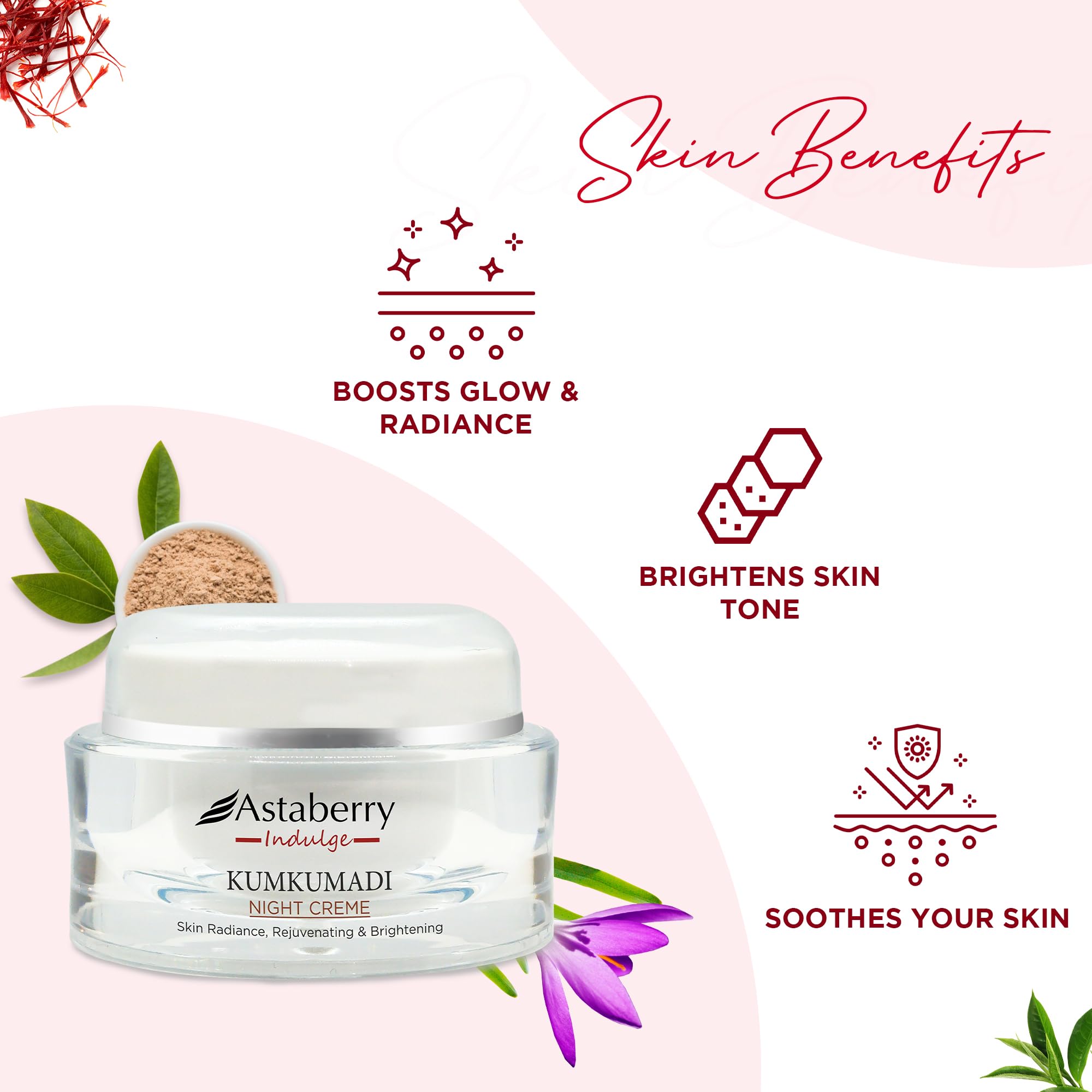 Astaberry Indulge Kumkumadi Night Cream for Glowing Skin | Dark Spot Reduction | Rejuvenates Dull Skin | For Normal Oily Acne-Prone Combination Skin | 50 g