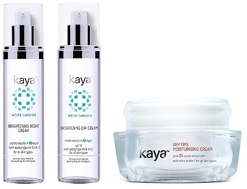 Kaya Brightening Day Cream | With Vitamin C & Azelaic Acid | Daily Use Moisturizer | SPF15 | Lightweight | Non Sticky | All Skin Types | 50mlBrightening your dull skin is now easy and hassle-free! Kaya Brightening Day Cream is your everyday companion for lighter brighter and flawless looking youthful skin in just 7 days* * Basis external study conductedKaya Anytime Moisturising Cream | Enriched With Shea Butter | Daily Use Cream | Lightweight Moisturizer | 24 Hours Hydration | All Skin Types | 50mlIf your skin is not healthy it will reflect on your complexion. The skin needs simple and adequate care to stay healthy and radiant. It requires a number of nutrients just like every other part of the body to remain healthy. Kaya Anytime Moisturizing Cream has a unique moisture-lock formula that keeps your skin moisturized and minimizes water loss from the skin keeping it soft and supple all day long.Kaya Brightening Night Cream | Azelaic Acid & Vitamin C Moisturizer For Visibly Brighter & Soft Skin | Hydrates Skin | All Skin Types | 50mlLooking for a product that can give you bright fresh skin every morning? Kaya Brightening Night Cream gives you a boost of nourishment so that you wake up to lighter & brighter skin in 7 days* * Basis external study conducted