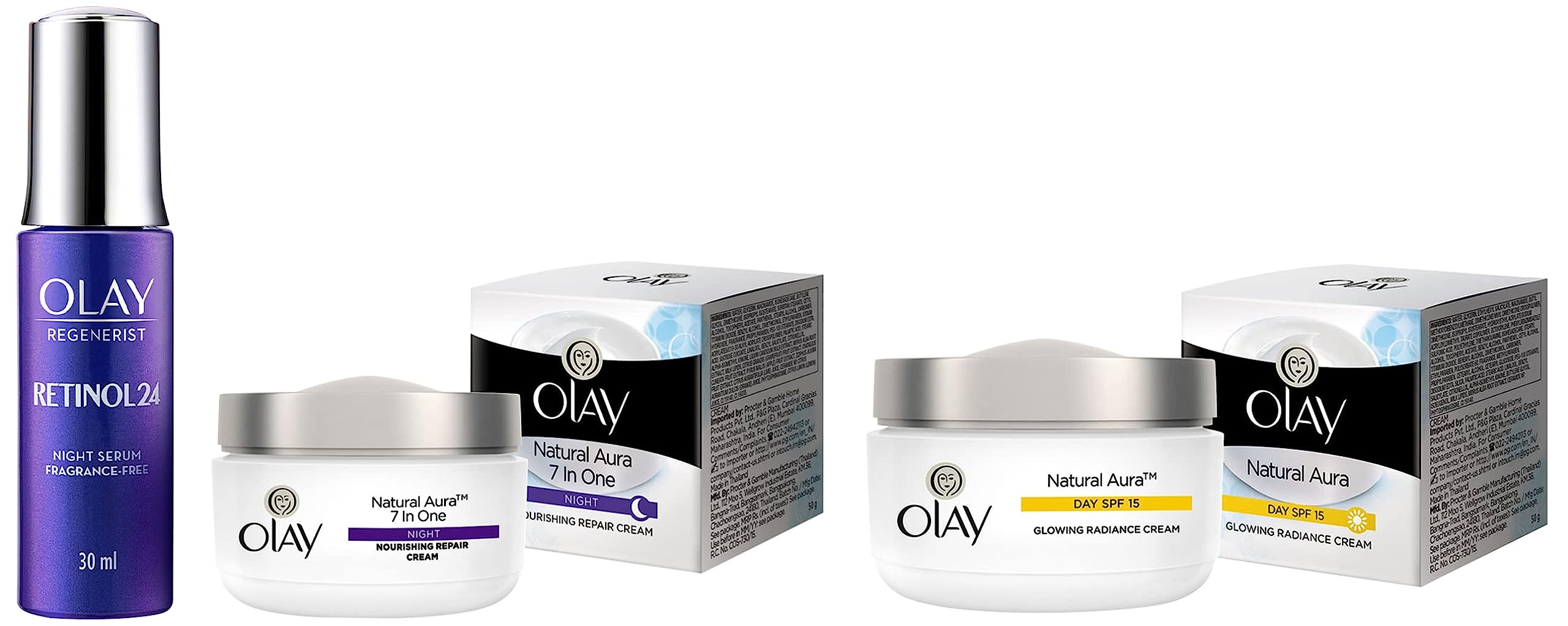 Olay Night Serum: Regenerist Retinol 24 Serum 30 mlDiscover our latest night serum that combines our propietary blend of Niacinamide + Retinol complex. Olay Regenerist RETINOL24 Night Facial Serum penetrates deep into skinâs surface layers. Youâll see visible improvements in fine lines & wrinkles smoothness brightness firming dark spots and pores. Olay RETINOL24 Night Serum delivers a bounty of skin benefits with 24-hour hydration and virtually no irritation. This fragrance free and dye free formula absorbs quickly and goes deep into your skinâs surface so you wake up every morning to younger-looking radiant skin. Use with Olay Regenerist Micro-Sculpting Cream at night and see the skin transformation in 28 daysOlay Day Cream Natural Aura Glowing Radiance Cream SPF 15 50gInternational bestseller Skincare Brand Olay has engineered a range of products that promises the perfect skin for all ages and across skin types. Natural White Day cream reveals skinâs natural and healthy fairness with the triple nutrient system in only 14 days. It Nourishes skin to lightens and brighten the skin tone. Experience the even skin tone and reduced appearance of dark spots. Visible Skin Results from Day 1. Get your Skin Hydrated smooth & plump. Start with the youthful glow for your skin now with the Olay Range. HOW IT WORKS Olay Natural White's unique Triple Vitamin Formula contains Vitamin 83 Pro Vitamin B5 and Vitamin E to help your skin achieve glowing fairness from within and provide 7 fairness benefits 7 FAIRNESS BENEFITS Lightens Skin tone Brightens Dull Skin Reduces dark spots Evens skin tone Moisturizes Smoothens Skin Sun Protection KEY INGREDIENTS Increases the rate of skin renewal Provides Intense Hydration and keeps your skin from looking dried A powerful and proven Anti- Oxidant to help protect your skin Olay Natural White All in One Fairness Skin Cream SPF 24 50g Lightens overall skin tone by reducing melanin transfer to skin surface while you sleep Reduces the appearance of dark spots Increases skin cell renewal to lighten for radiant looking skin each morning Has SPF 24 to give your skin protective skin Provides anti-oxidant protection Keeps skin well moisturized How to Apply: Apply a small amount all over face and massage gently in circular motion & Follow Regimen steps for best results THE OLAY STORY Olay is a product truly born from love as it was created by a man as a gift for his wife. In the 1950s chemist Graham Wulff saw his wife Dinah's frustration with the thick waxy beauty creams that left her skin looking greasy. Graham wanted to create a new beauty product for her that could not only moisturize her skin but also leave her feeling beautiful and feminine. Together Graham and Dinah fine-tuned everything from absorption and texture to the instantly recognizable fragrance. At last the legendary Oil of Olay Beauty Fluid was born. Today Olay is one of the most recognizable brands in the world and is the World's No.7 selling facial skin care brand. Yet through all the changes and innovations the philosophy upheld by Graham Wulff remains just as relevant as ever: Help women look and feel beautiful. That's a potent formula for success. THE OLAY PROMISE Olay is committed to providing safe products to our consumers. Ensuring the safety of our products is a responsibility that Olay takes very seriously. Each year Olay conducts over 400000 safety and quality tests to ensure an excellent experience for women around the world. For more information about the safety of Olay products and ingredients please go to .Olay Night Cream Natural Aura Nourishing Repair Cream50gInternational bestseller Skincare Brand Olay has engineered a range of products that promises the perfect skin for all ages and across skin types. Natural Aura night is designed to deliver nutrients at night for a natural and healthy looking fair skin. It Nourishes skin while sleeping to lightens and brighten the skin tone. Wake up to even skin tone and reduced appearance of dark spots. Visible Skin Results from Day 1. Get your Skin Hydrated smooth & plump. Start with the youthful glow for your skin now with the Olay Range. HOW IT WORKS Olay Natural White's unique Triple Vitamin Formula contains Vitamin 83 Pro Vitamin B5 and Vitamin E to help your skin achieve glowing fairness from within and provide 7 fairness benefits 7 FAIRNESS BENEFITS Lightens Skin tone Brightens Dull Skin Reduces dark spots Evens skin tone Moisturizes Smoothens Skin Sun Protection KEY INGREDIENTS Increases the rate of skin renewal Provides Intense Hydration and keeps your skin from looking dried A powerful and proven Anti- Oxidant to help protect your skin Olay Natural White All in One Fairness Night Nourishing Repair Skin Cream 50g Lightens overall skin tone by reducing melanin transfer to skin surface while you sleep Reduces the appearance of dark spots Increases skin cell renewal to lighten for radiant looking skin each morning Provides anti-oxidant protection Keeps skin well moisturized How to Apply: Apply after cleansing skin - use your fingertips and smooth evenly onto clean skin over face and neck. Apply just before going to bed & Follow Regimen steps for best results THE OLAY STORY Olay is a product truly born from love as it was created by a man as a gift for his wife. In the 1950s chemist Graham Wulff saw his wife Dinah's frustration with the thick waxy beauty creams that left her skin looking greasy. Graham wanted to create a new beauty product for her that could not only moisturize her skin but also leave her feeling beautiful and feminine. Together Graham and Dinah fine-tuned everything from absorption and texture to the instantly recognizable fragrance. At last the legendary Oil of Olay Beauty Fluid was born. Today Olay is one of the most recognizable brands in the world and is the World's No.7 selling facial skin care brand. Yet through all the changes and innovations the philosophy upheld by Graham Wulff remains just as relevant as ever: Help wo