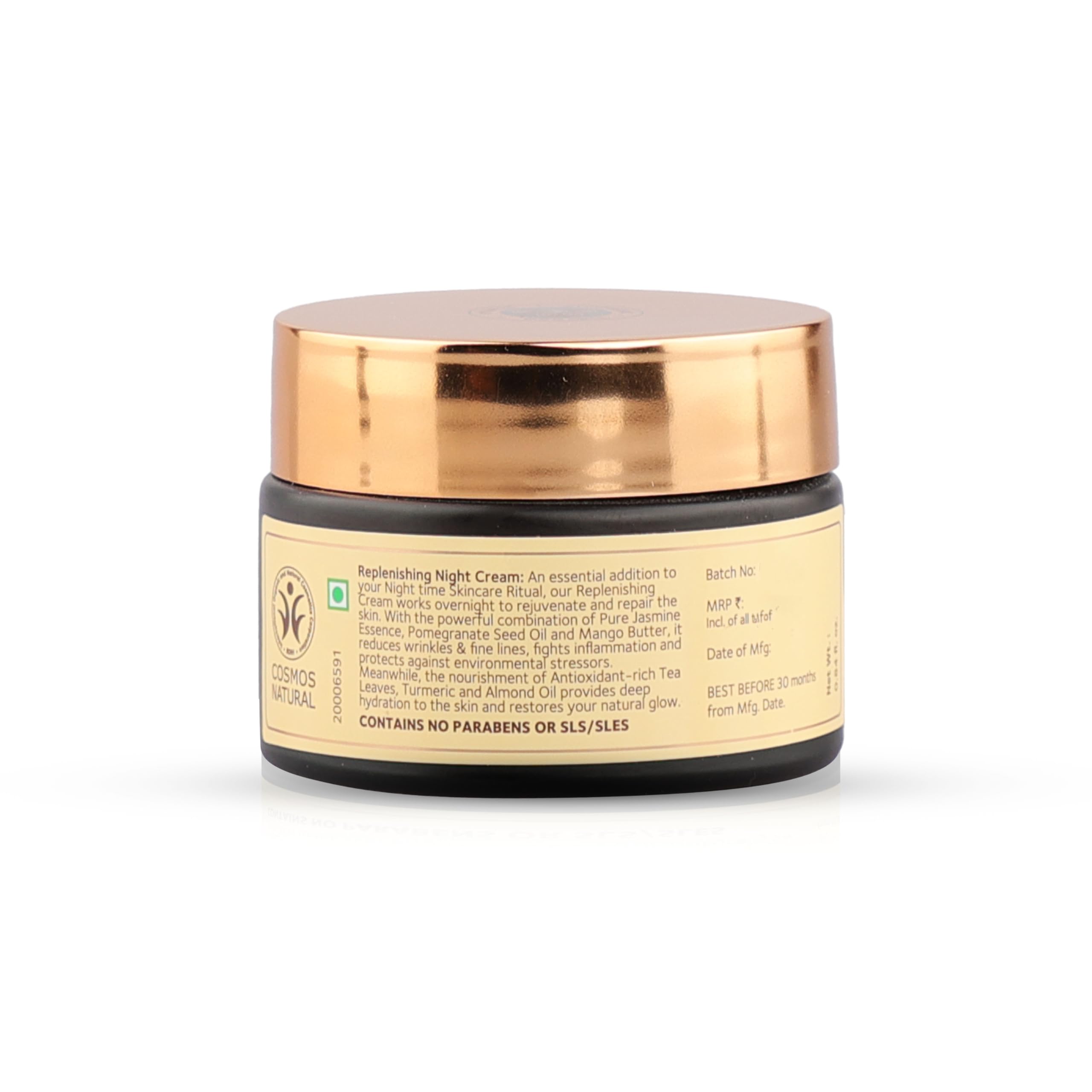 An essential addition to your Night time Skincare Ritual our Replenishing Cream works overnight to rejuvenate and repair the skin. With the powerful combination of Pure Jasmine Essence Pomegranate Seed Oil and Mango Butter it reduces wrinkles & fine lines fights inflammation and protects against environmental stressors. Meanwhile the nourishment of Antioxidant-rich Tea Leaves Turmeric and Almond Oil provides deep hydration to the skin and restores your natural glow.