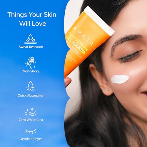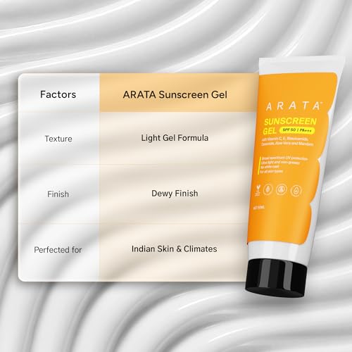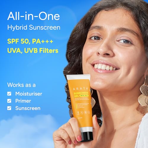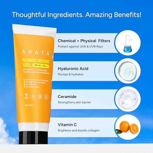 • BROAD SPECTRUM UVA/UVB PROTECTION: Arata Sunscreen Gel comes with SPF 50 PA+++ and high-performing UV filters that block UVA and UVB rays. Further it is infused with a powerful blend of Vitamins E and C that helps protect your skin from long-term sun dama