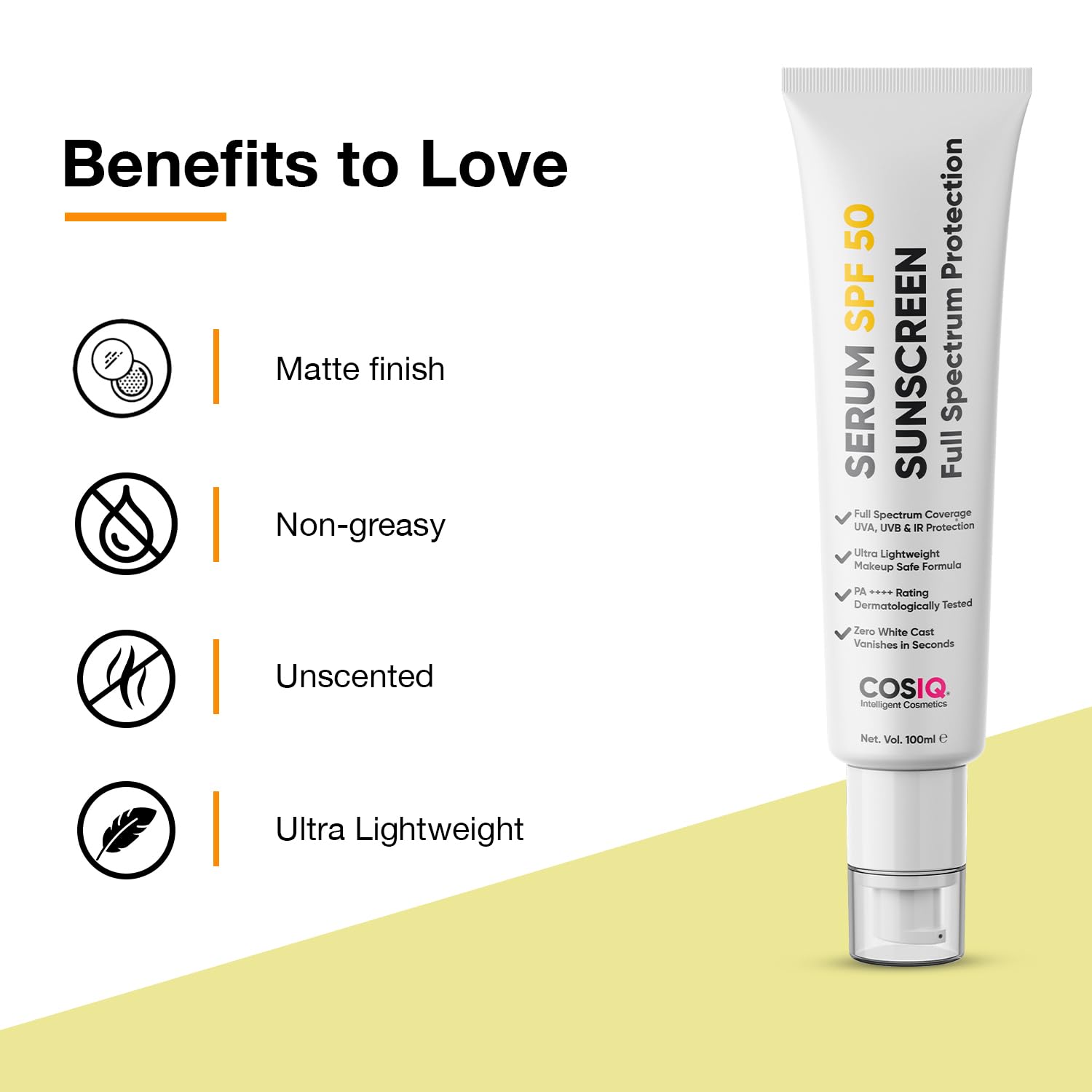 Cos-IQ Sunscreen SPF 50 PA++++ Serum | UVA/B & Blue Light Protection for Men & Women | Broad Spectrum Sun Protection | Oily Dry Sensitive & Combination Skin | Fragrance-Free No White Cast | 100ml