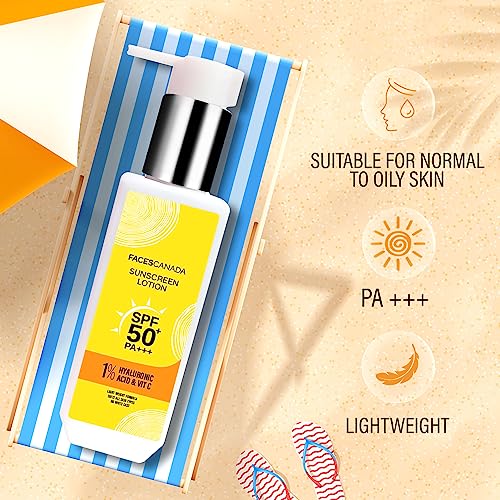 FACES CANADA Sunscreen Lotion, 100ml | SPF 50 PA+++ | Protects From UVA & UVB Rays | 1% Hyaluronic Acid & Vitamin C | Lightweight | No White Cast | Natural Radiant Glow| No Alcohol | No Parabens