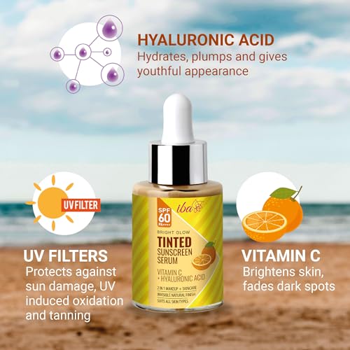Iba Bright Glow Tinted Sunscreen Serum for All Skin Types SPF 60 PA++++ with Hyaluronic Acid & Vitamin C, 30ml | Broad Spectrum- UVA & UVB Protection | For Glowing & Sun-Safe Skin | No White Cast