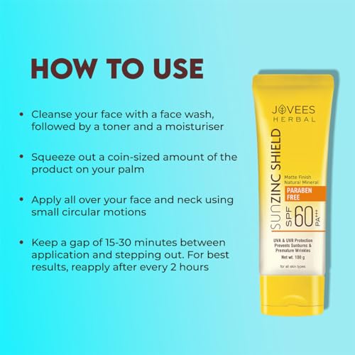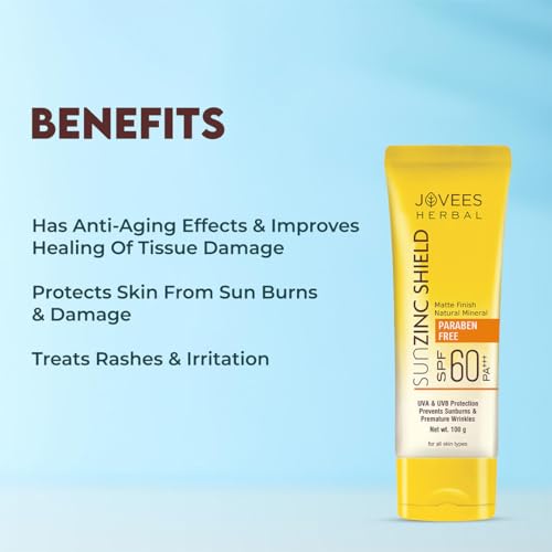 MOISTURIZING: Jovees Sun Zinc Shield SPF 60 effectively moisturizes the skin while providing sun protection. Its unique formula combines the benefits of Zinc Oxide and natural moisturizing agents to keep the skin hydrated and supple.
