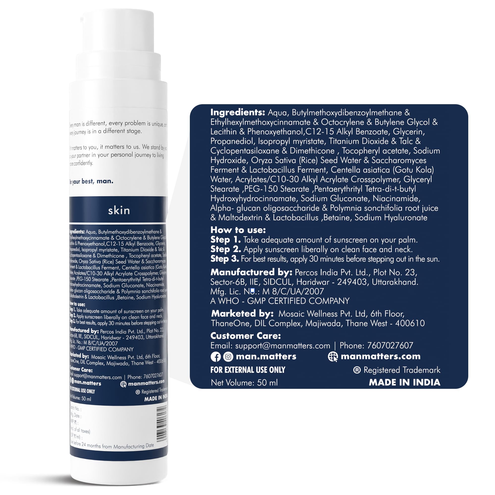 Man Matters Probiotic Sunscreen SPF 50 PA++++ 50ml | SunCat MTA Technology | Sweat Resistant & Broad Spectrum Protection | Centella Rice Water & Niacinamide | Non Greasy 0 White Cast & Lightweight