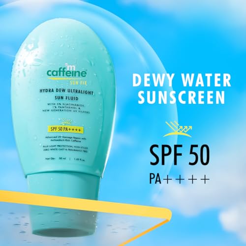 mCaffeine Hydra Dew Ultralight Sun Fluid SPF50 PA++++ UVA/UVB Blue Light Protection|Water Like Glow Texture|Lightweight, Non-Sticky, Quick Absorbing|No White Cast|All Skin Types|For Men/Women - 50ml