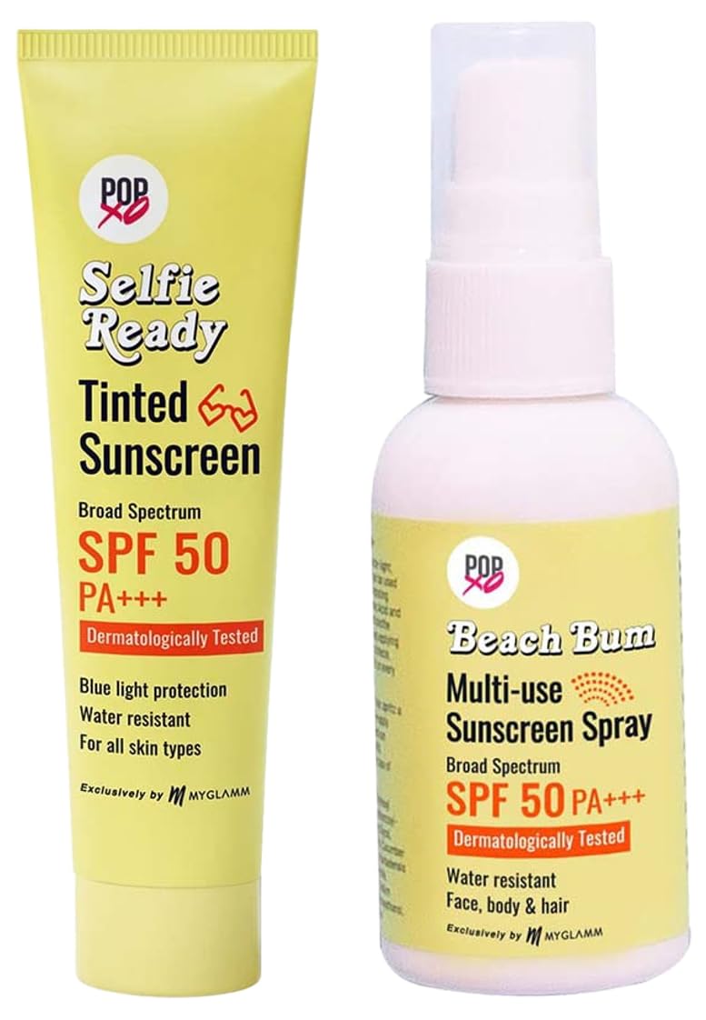 MyGlamm POPxo Beach Bum Ultra-Light Sunscreen Spray SPF 50-50gmIf you were looking for a way to make sunscreen a habit - we've got you girl. This SPF 50 PA+++ sunscreen spray is the perfect addition to your skincare fam. And this everyday spray is what's going to keep your skin looking like #goals! The POPxo Beach Bum Ultra-Light Sunscreen Spray SPF 50 you get to stay protected without doing the work. This face body and hair spray is a multi-tasking miracle making it the real MVP of sun protection. Hyaluronic Acid Raspberry Seed Oil and Cucumber extract give this formula a whole lotta skin-lovin'. This alcohol-free spray is hydrating and nourishing with an uber-light texture that lets you layer this under or over makeup without worrying about a white cast! It also gets into all those pesky hard-to-reach spots with zero effort and is a breeze when it comes to reapplication making your life easier and your skin SO much better. Break up with grease and make up with your suncare BFF that'll never leave your side!MyGlamm POPxo Selfie-Ready Tinted Sunscreen SPF 50-30gmScrolling through Instagram wondering what is the secret to âgorgeous gorgeous girl' skin? Well the answer is easy and it ain't news - sunscreen! Your new holy grail is this multi-tasking SPF 50 PA+++ tinted moisturiser that will give you the best selfies ever (and a great excuse to reapply). With the POPxo Selfie-Ready Tinted Sunscreen SPF 50 make a skinvestment that'll make your future self say âgo little rockstar'. Like all good things we know how to make your sunscreen werk girl! Its lightweight mousse formula melts into the skin with zero effort and the primer-like finish reduces shine and smoothes skin giving you IRL filtered skin in just one step. The sheer tint ensures there's no icky white cast to worry about so no blending no fuss and no excuses just a soft-focus finish that'll up your Insta-game x1000! Our tinted sunscreen It fights against photo-ageing and blue light while soothing your skin and Spinach Extract gives you an added boost of antioxidants. The non-sticky texture makes it a rockstar under makeup and its water-resistant properties make it your perfect pick for the beach and pool. If you're a first-timer it doesn't get easier or more effective than this.