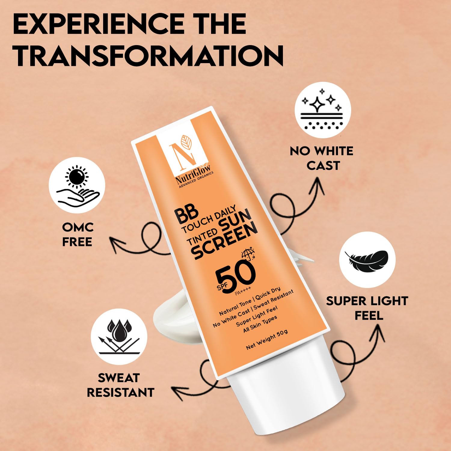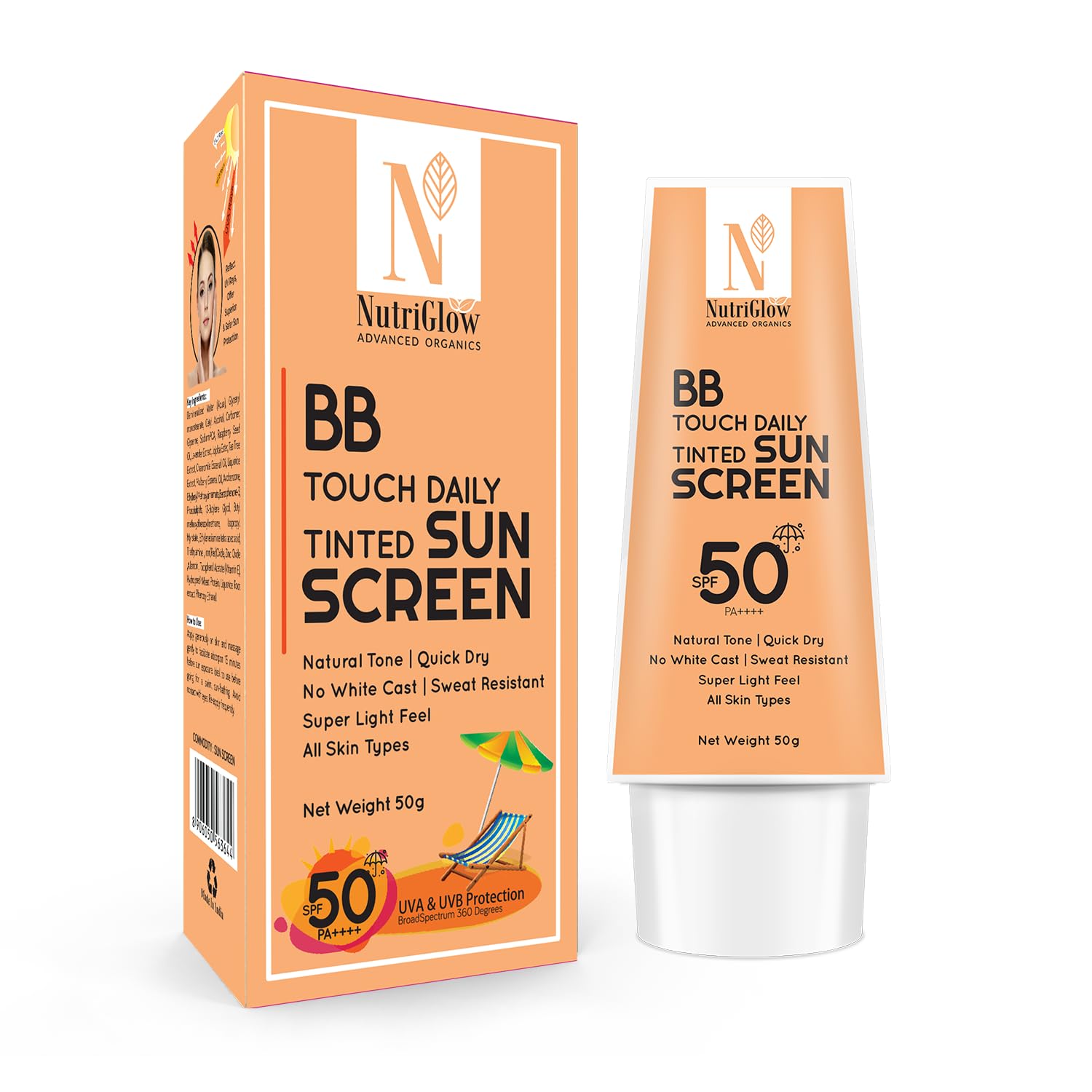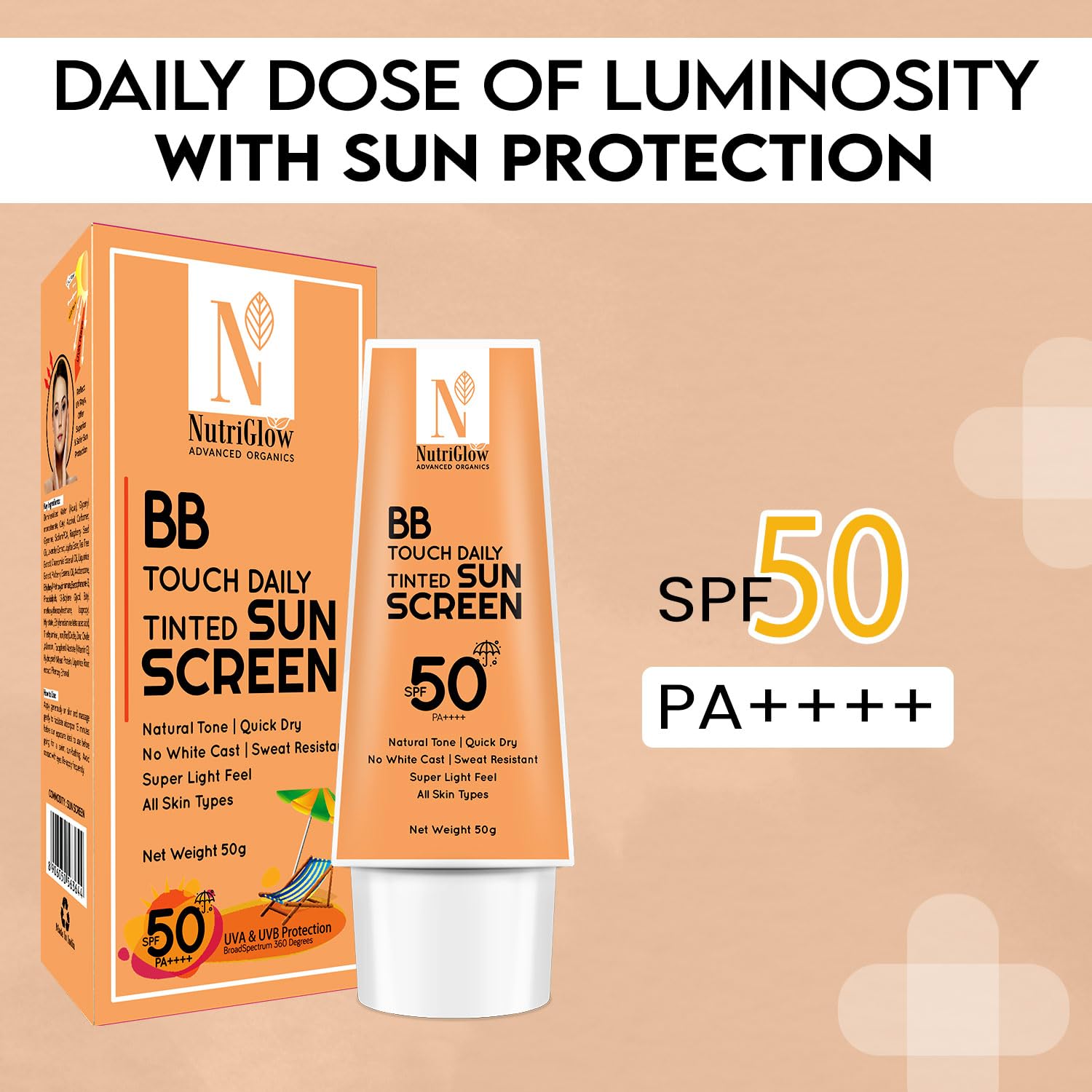 NutriGlow Advanced Organics BB Touch Daily Tinted Sunscreen PA++++ No White Cast Lightweight / UV A & UV B Blue Light Protection For Unisex Body & Face Suitable for Oily Dry Sensitive & Combination Skin (50g)