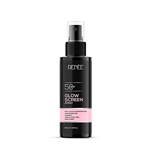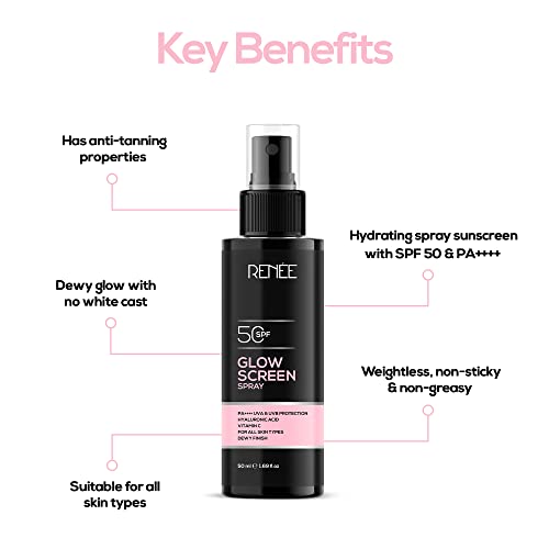 Hydrating spray sunscreen with SPF 50 & PA++++ Enriched with Hyaluronic acid & Vitamin C Weightless & non-greasy Leaves no white cast Shield your skin with a spray Looking for a sunscreen that hydrates nourishes & protects without being greasy? Here RENEE Glowscreen Sunscreen Spray with SPF 50 and broad spectrum to your rescue. Apart from SPF 50 and PA++++ protection this sunscreen has a lightweight & quick absorbing formula enriched with the goodness of Vitamin C and Hyaluronic Acid. With the combined effect of these ingredients this sunscreen is uniquely crafted to give multiple benefits like protecting the skin from sun rays keeping the skin moisturized evening out the skin tone and restoring its natural glow. RENEE Glowscreen Spray Sunscreen SPF 50 is perfect for daily use especially for those who are always on-the-go. Its spray nozzle allows for quick and easy application making it ideal for use at the beach during outdoor activities or while traveling. Its compact size also makes it easy to carry with you wherever you go.