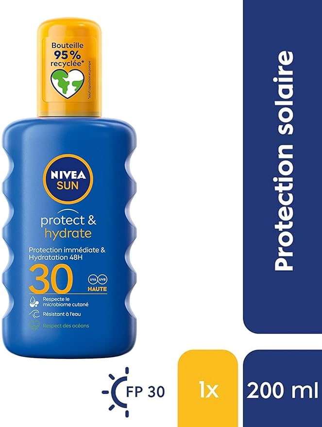 NIVEA SUN Protect & Moisture Sun Spray contains highly effective UVA/UVB filters and immediately protects against sun exposure and long term UV-induced skin damage. The sunscreen helps to reduce the risk of sun allergies, offers long-lasting and intensive moisturisation and is water resistant. Long-lasting and intensive moisture Helps reduce the risk of sun allergies Highly effective UVA/UVB protection Immediately protects against sun exposure and long term UV-induced skin damage Water resistant
