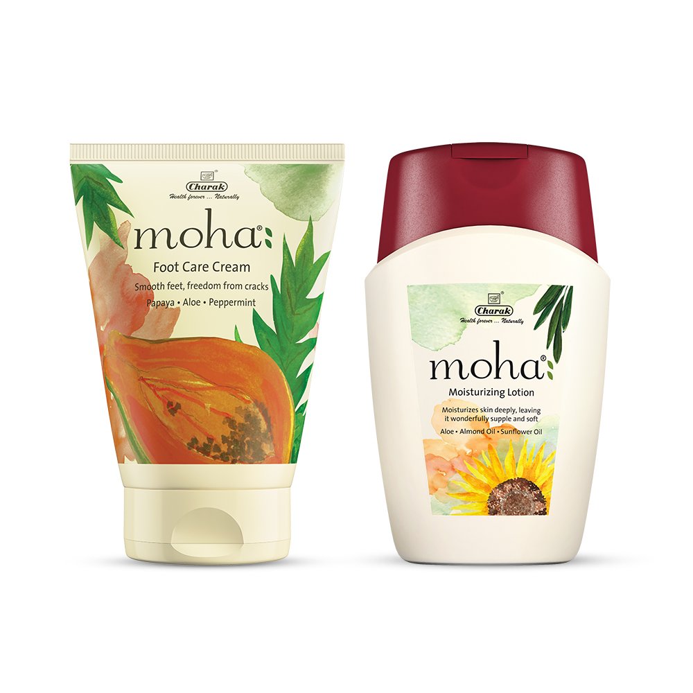 Moha foot care cream 100 grams. Papaya and aloe join hands to give your feet the soft texture you crave with this luxurious foot care cream. This luscious creamy formula soothes away calluses and cracks leaving your feet smooth and soft. Features: softens soothes and protects foot skin from getting damaged. Heals cracked and dry feet. Deeply nourishes moisturizes and repairs skin. Moha moisturizing lotion 100 ml. Pamper your skin with this rich nourishing moha moisturizing lotion. Enriched with aloe gel and a blend of almond and olive oils it protects and moisturizes your skin deeply leaving it wonderfully supple and soft. Key features: imparts optimal moisturization to skin. Nourishes and protects. Repairs the skin barrier and keeps the skin hydrated and soft. Maintains skin integrity. Reduces transepidermal water loss.