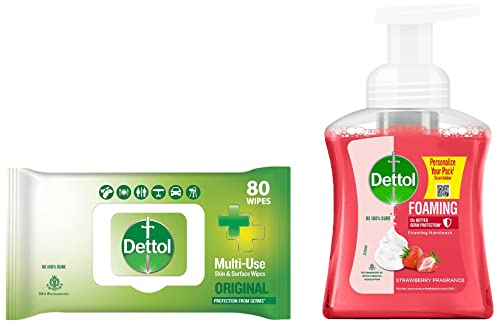 Dettol Disinfectant Sanitizer Wet Wipes for Skin & Surfaces Original â 80 Count| Moisture-Lock Lid | Safe on Skin | Ideal to Clean SurfacesDettol's Disinfecting Skin & Surface Wipes are Safe on Skin Ideal to Clean Multiple Surfaces Easy to carry with a resealable Moisture-lock lid. Dettol disinfecting wipes are practical for everyday use on furniture taps sinks door knobs kitchen bathroom surfaces floor cleaning childrenâs surfaces and places that are germ hotspots. It can be used on most hard non-porous surfaces including Finished Wood Sealed Marble Stainless Steel Laminated Floors Glass and Plastic.Dettol Foaming Handwash Pump - Strawberry 250ml | Rich Foam | Moisturizing Hand Wash | Soft on HandsBe 100% sure to protect your skin from germs and bacteria. Dettol foaming handwash is a moisture-rich foam that removes dirt and germs while being gentle on skin. This hand wash provides soft and rich lather leaving behind clean hands and mild strawberry fragrance. Dettol handwash is dermatologically tested. Dettol handwash are free from parabens/ TCC and are ph balanced.