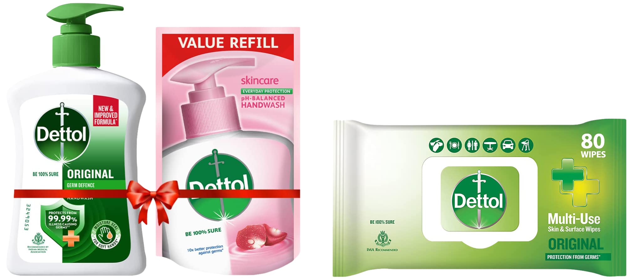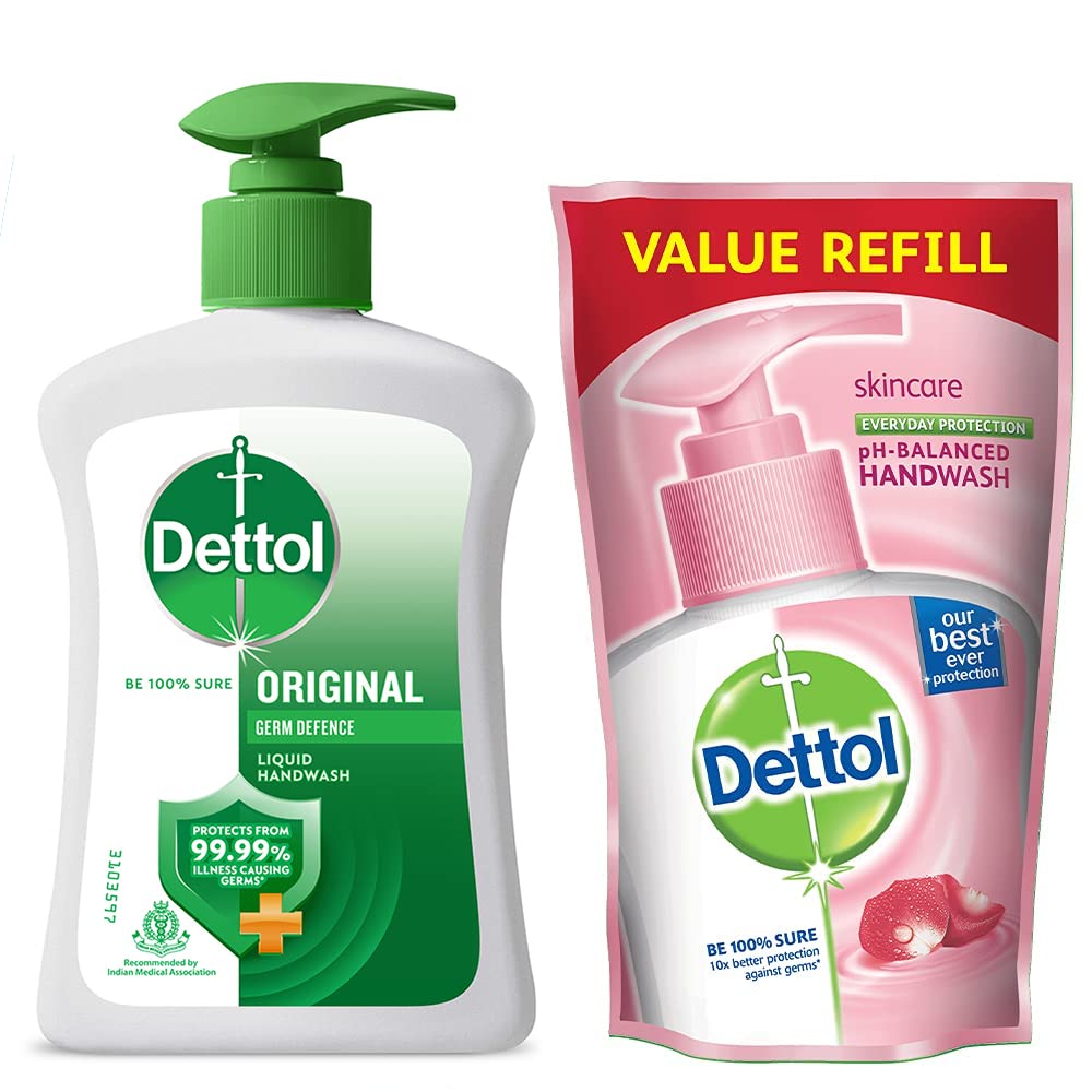 Dettol Disinfectant Sanitizer Wet Wipes for Skin & Surfaces Original â 80 Count| Moisture-Lock Lid | Safe on Skin | Ideal to Clean SurfacesDettol's Disinfecting Skin & Surface Wipes are Safe on Skin Ideal to Clean Multiple Surfaces Easy to carry with a resealable Moisture-lock lid. Dettol disinfecting wipes are practical for everyday use on furniture taps sinks door knobs kitchen bathroom surfaces floor cleaning childrenâs surfaces and places that are germ hotspots. It can be used on most hard non-porous surfaces including Finished Wood Sealed Marble Stainless Steel Laminated Floors Glass and Plastic.Dettol Liquid Handwash Original Germ Protection- 200 ml with Free Liquid Handwash - 175 ml (Skincare)Be 100% sure to protect your skin from 100 illness-causing germs and bacteria. Use Dettol's Original Germ Protection Handwash Liquid Soap pH balanced formula every day and keep your hands hygienically clean and refreshed. This hand wash provides soft and rich lather leaving behind clean hands and mild pine fragrance. The trusted germ-protection modus operandi acts like a barrier between your hands and a wide range of unseen germs. The soap-free formula with glycerin makes sure to keep your skin moisturised while the plant derived cleansers help ensure thorough cleaning. Dettol handwash also contains more than 85% naturally derived ingredients with no TCC & Triclosan giving another healthy reason for hand washing whenever in need. Wash hands properly with Dettol and help keep your family healthy! Safety Information: Keep out of reach of children unless under adult supervision. Avoid direct contact with eyes. For external use. In case of contact with eyes rinse immediately with plenty of water. If persistent irritation occurs seek medical attention.