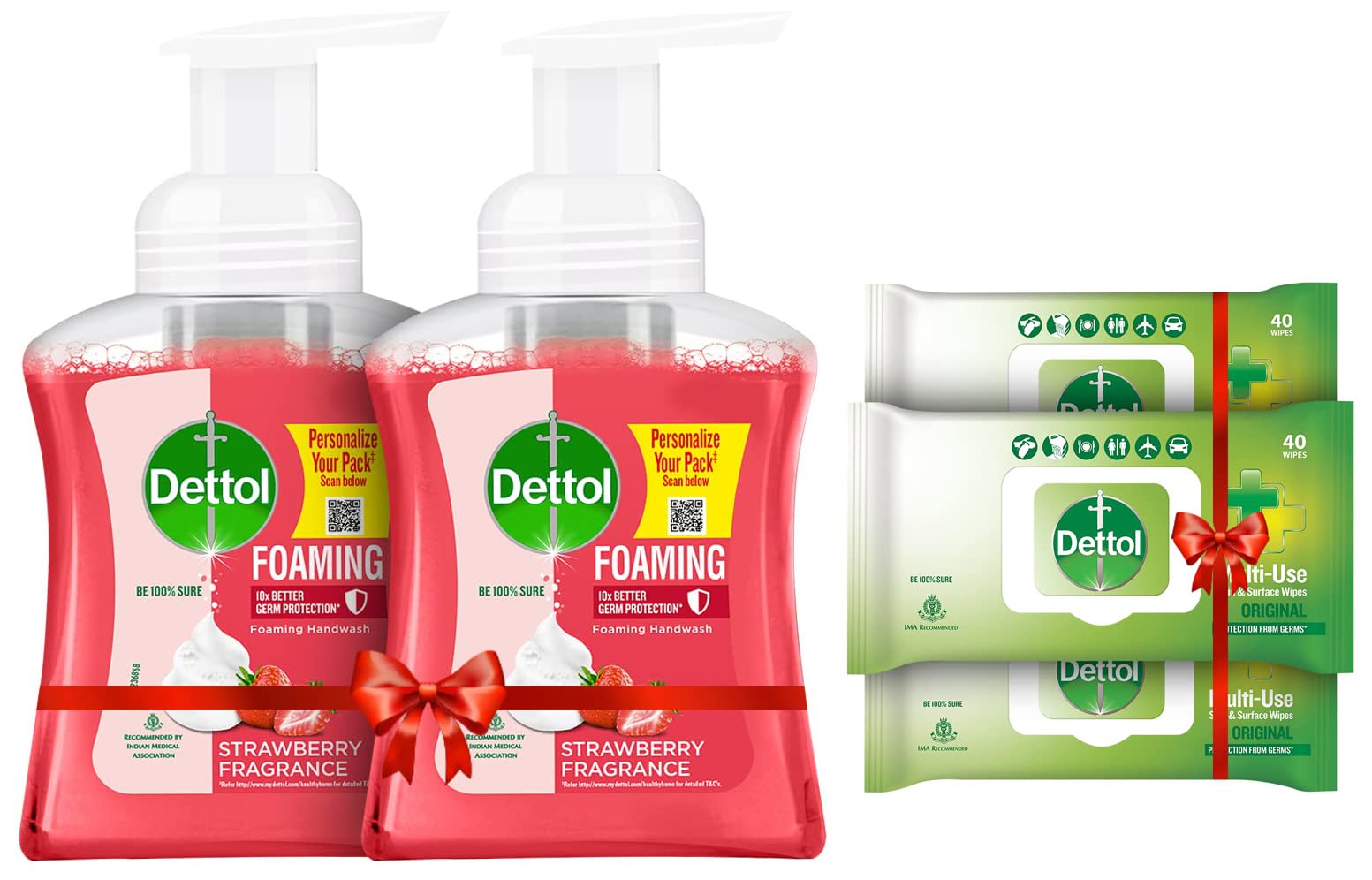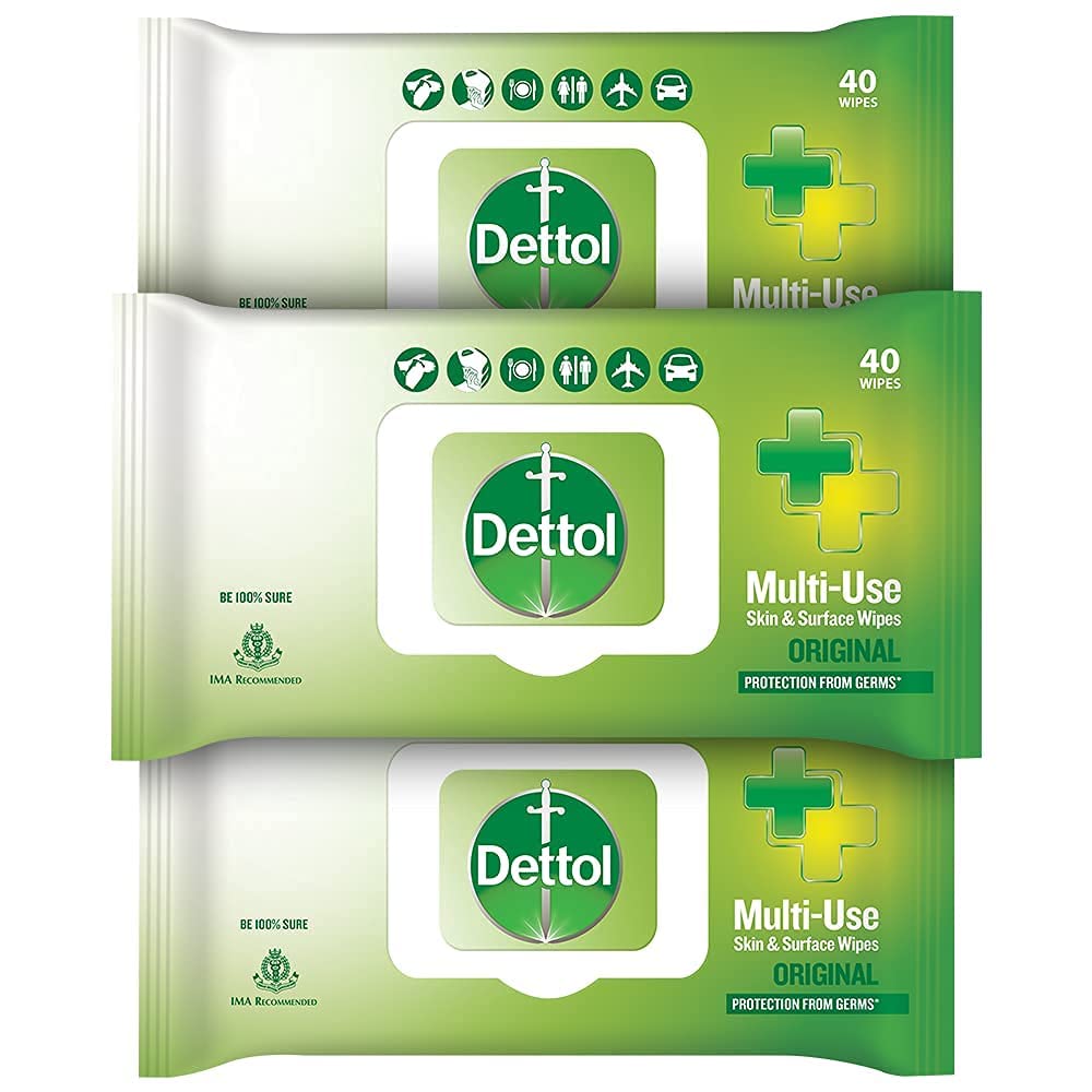 Dettol Disinfectant Sanitizer Wet Wipes for Skin & Surfaces Original (Pack of 3 40 Count each) | Moisture-Lock Lid | Safe on Skin | Ideal to Clean SurfacesDettol's Disinfecting Skin & Surface Wipes are Safe on Skin Ideal to Clean Multiple Surfaces Easy to carry with a resealable Moisture-lock lid. Dettol disinfecting wipes are practical for everyday use on furniture taps sinks door knobs kitchen bathroom surfaces floor cleaning childrenâs surfaces and places that are germ hotspots. It can be used on most hard non-porous surfaces including Finished Wood Sealed Marble Stainless Steel Laminated Floors Glass and Plastic.Dettol Foaming Handwash Pump - Strawberry (Pack of 2-250ml each) | Rich Foam | Moisturizing Hand Wash | Soft on HandsBe 100% sure to protect your skin from germs and bacteria. Dettol foaming handwash is a moisture-rich foam that removes dirt and germs while being gentle on skin. This hand wash provides soft and rich lather leaving behind clean hands and mild strawberry fragrance. Dettol handwash is dermatologically tested. Dettol handwash are free from parabens/ TCC and are ph balanced.