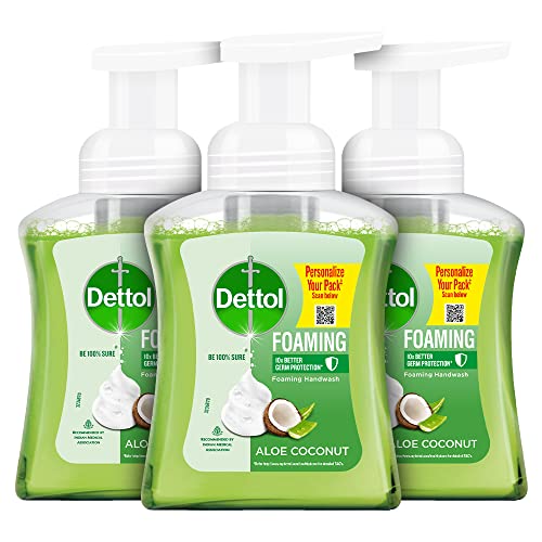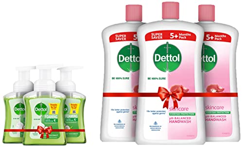 Dettol Foaming Handwash Pump - Aloe Coconut (Pack of 3-250ml each) | Rich Foam | Moisturizing Hand Wash | Soft on HandsBe 100% sure to protect your skin from germs and bacteria. Dettol foaming handwash is a moisture-rich foam that removes dirt and germs while being gentle on skin. This hand wash provides soft and rich lather leaving behind clean hands and mild aloe coconut fragrance. Dettol handwash is dermatologically tested. Dettol handwash are free from parabens/ TCC and are ph balanced.Dettol Liquid Handwash Refill Bottle - Skincare Moisturizing Hand Wash (Pack of 3 - 900ml each) | Antibacterial Formula | 10x Better Germ ProtectionBe 100% sure to protect your skin from 100 illness-causing germs and bacteria. Use Dettol's Skincare Germ Protection Handwash Liquid Soap pH balanced formula every day and keep your hands hygienically clean and refreshed. This hand wash provides soft and rich lather leaving behind clean hands and fragrance. The trusted germ-protection modus operandi acts like a barrier between your hands and a wide range of unseen germs. The soap-free formula with glycerin makes sure to keep your skin moisturised while the plant derived cleansers help ensure thorough cleaning. Dettol handwash also contains more than 85% naturally derived ingredients with no TCC & Triclosan giving another healthy reason for hand washing whenever in need. Wash hands properly with Dettol and help keep your family healthy! Safety Information: Keep out of reach of children unless under adult supervision. Avoid direct contact with eyes. For external use. In case of contact with eyes rinse immediately with plenty of water. If persistent irritation occurs seek medical attention.