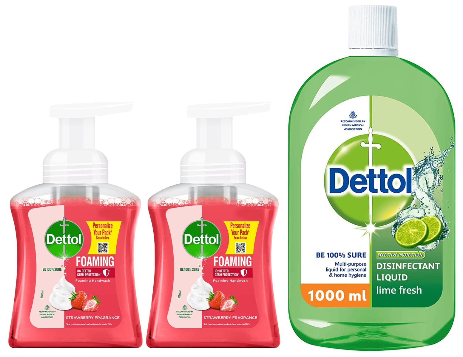 Dettol Liquid Disinfectant for Floor Cleaner Surface Disinfection Personal Hygiene (Lime Fresh 1L)Dettol Disinfectant Multipurpose Liquid cleaner provides protection to you and your family against illness causing germs. This disinfectant liquid sanitizes your home and also helps maintain your personal hygiene. It can be used in bath laundry floor and surface cleaning leaving everything clean and fresh. This multipurpose disinfenctant cleaner for home is recommended by Indian Medical Association. USAGE: Recommended dilutions to protect your family from germs: Bathing - 1 capful to a bucket of water (10 litres); Kitchen Slab - 1 capful to a litre of water; Shaving - 1 capful to a litre of water; Floor Cleaning - 1 capful to a litre of water; Laundry - 1 capful to a litre of water in the last rinse; Refrigerator - 1 capful to a litre of water. If swallowed seek immediate medical advise.Dettol Foaming Handwash Pump - Strawberry (Pack of 2-250ml each) | Rich Foam | Moisturizing Hand Wash | Soft on HandsBe 100% sure to protect your skin from germs and bacteria. Dettol foaming handwash is a moisture-rich foam that removes dirt and germs while being gentle on skin. This hand wash provides soft and rich lather leaving behind clean hands and mild strawberry fragrance. Dettol handwash is dermatologically tested. Dettol handwash are free from parabens/ TCC and are ph balanced.